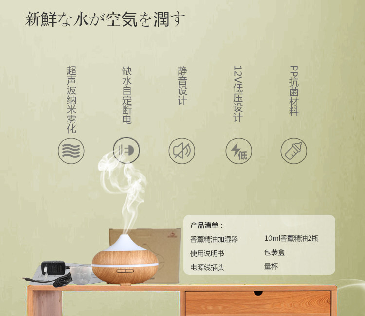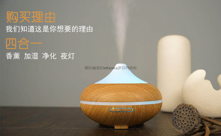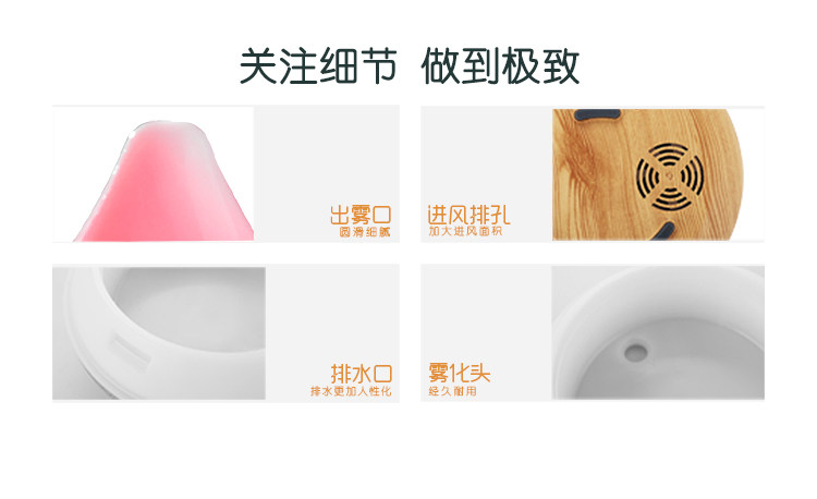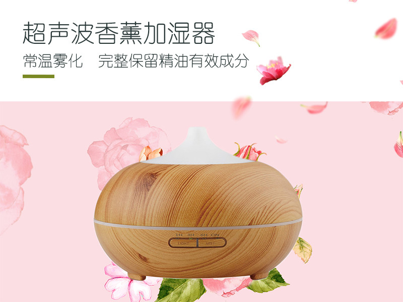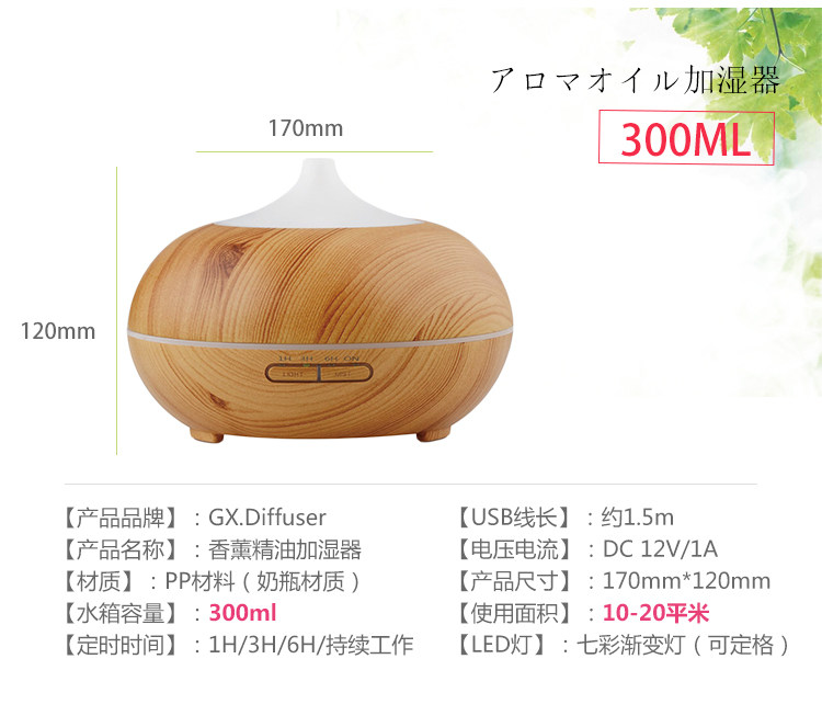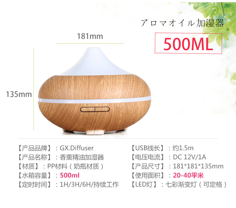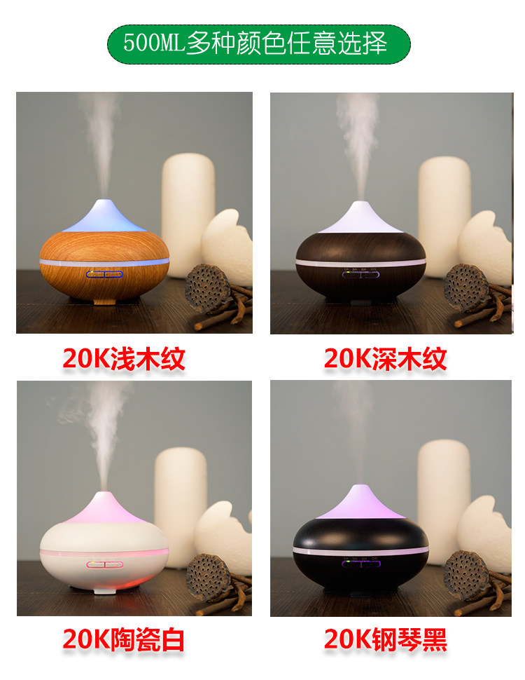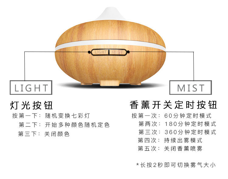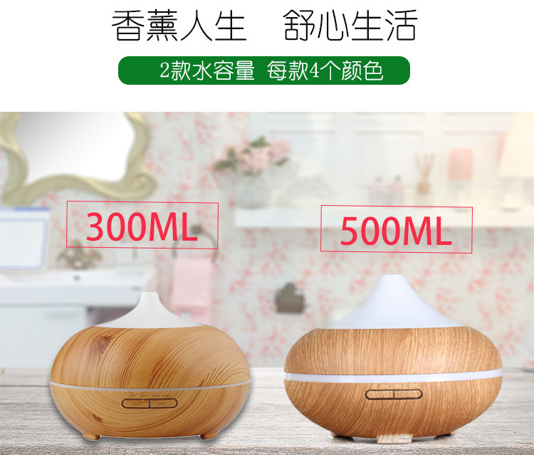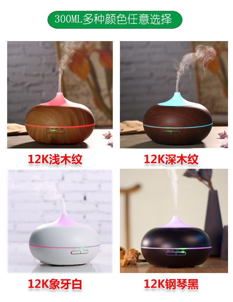 1. 此款宝贝有300ml,500ml:12小时以上持续工作,7彩夜灯,4档定时模式,2档雾气调节等。