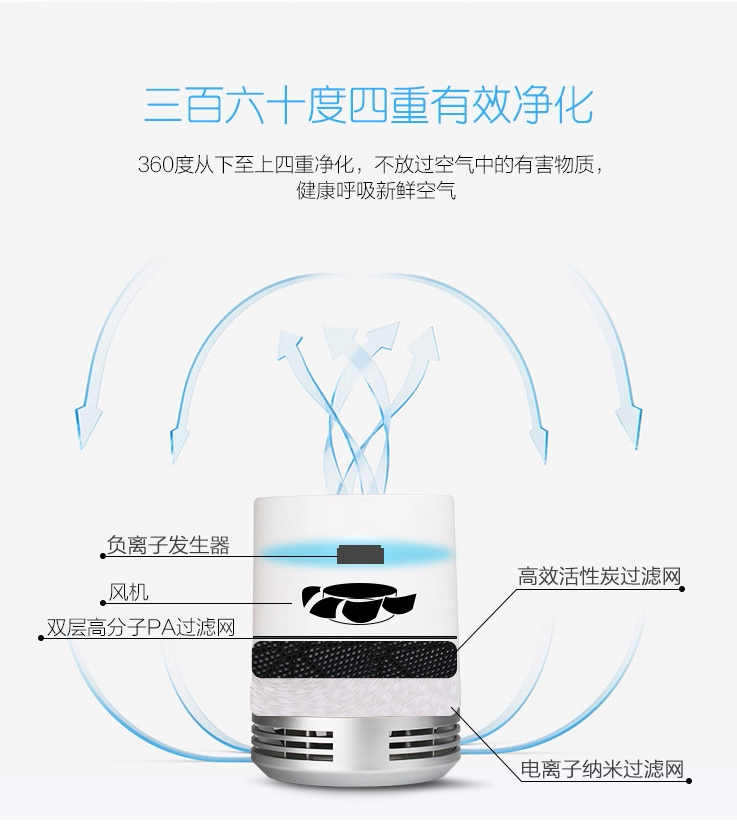 • 功能:除颗粒物 除花粉 除VOC 定时 除甲醛 除烟除尘 杀菌 加氧 除雾霾 除菌, 负离子 除菌