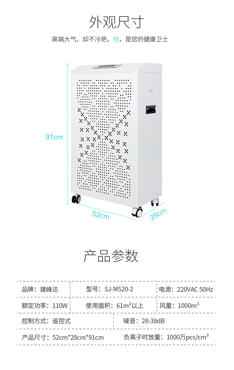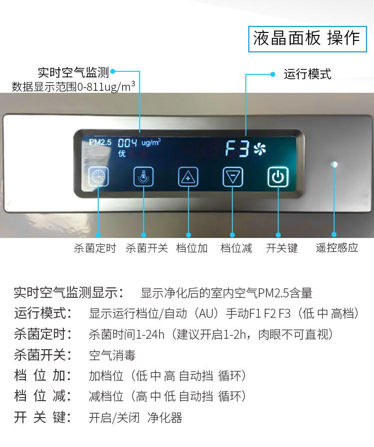• 功能:缺氧监测 定时 除VOC 除花粉 除颗粒物 除甲醛 除烟除尘 杀菌 加湿 加氧 除雾霾 除菌, 负离子 除菌