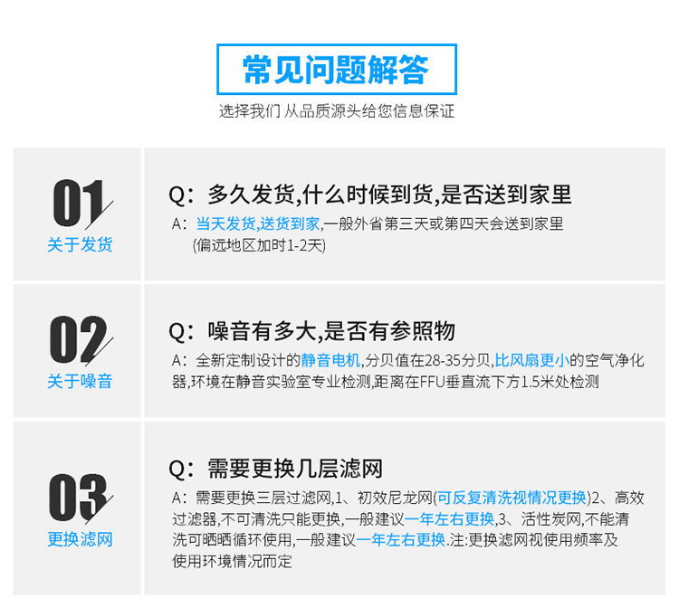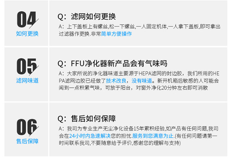 本产品是工业产品,完美人士慎拍,收货后如因外观、做工、噪音不满意退、换货,买家需付双程运费及过滤器费用。本公司FFU风机质保一年,七天内免费包换;过滤器属于消耗品,不在退换、保修、维护范围。所需更换配件,快递后自行更换,所产生的运费各自承担一半。