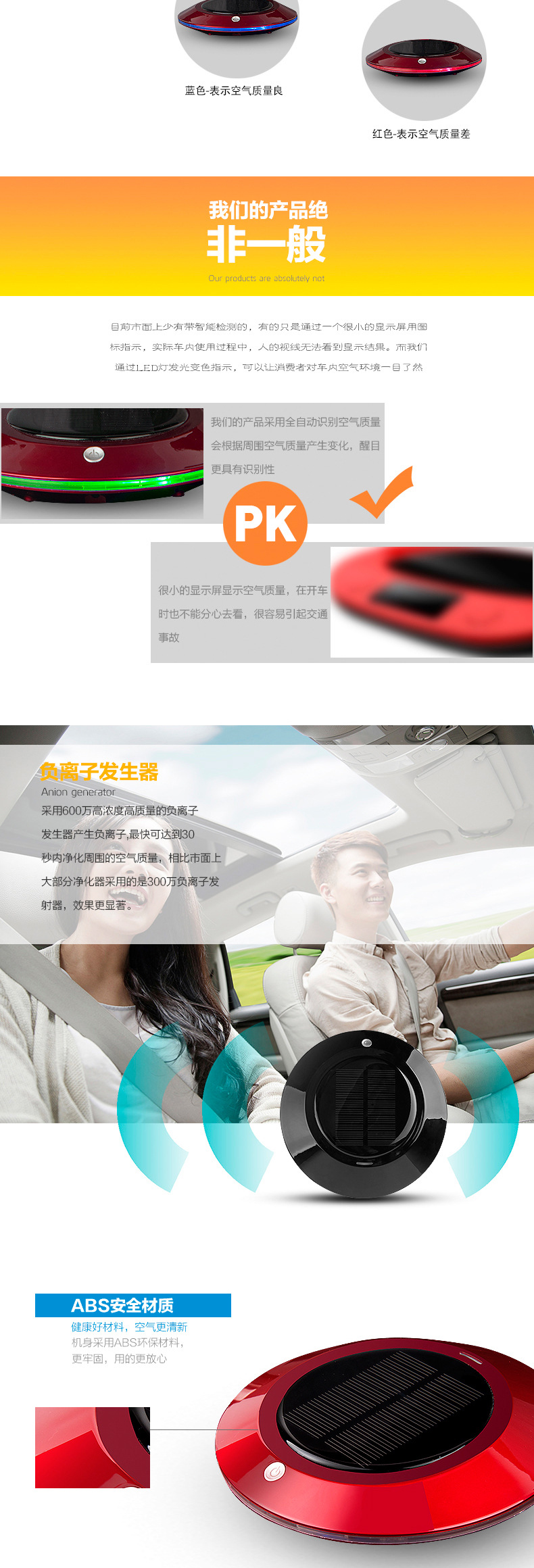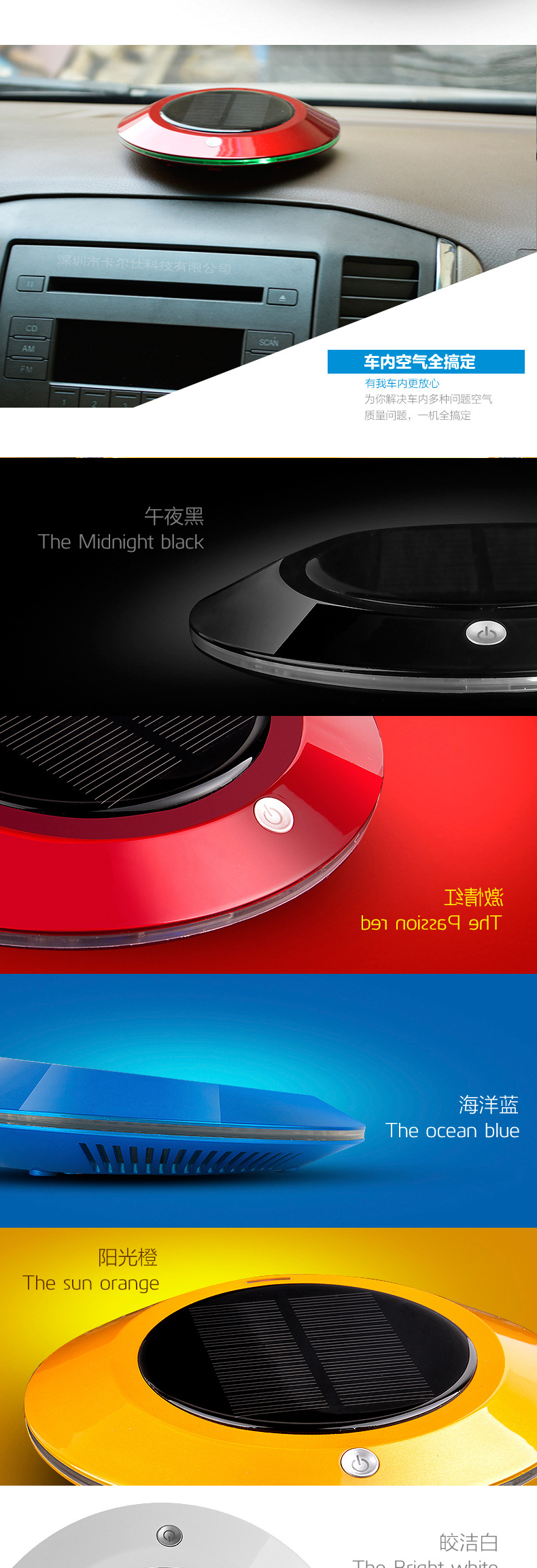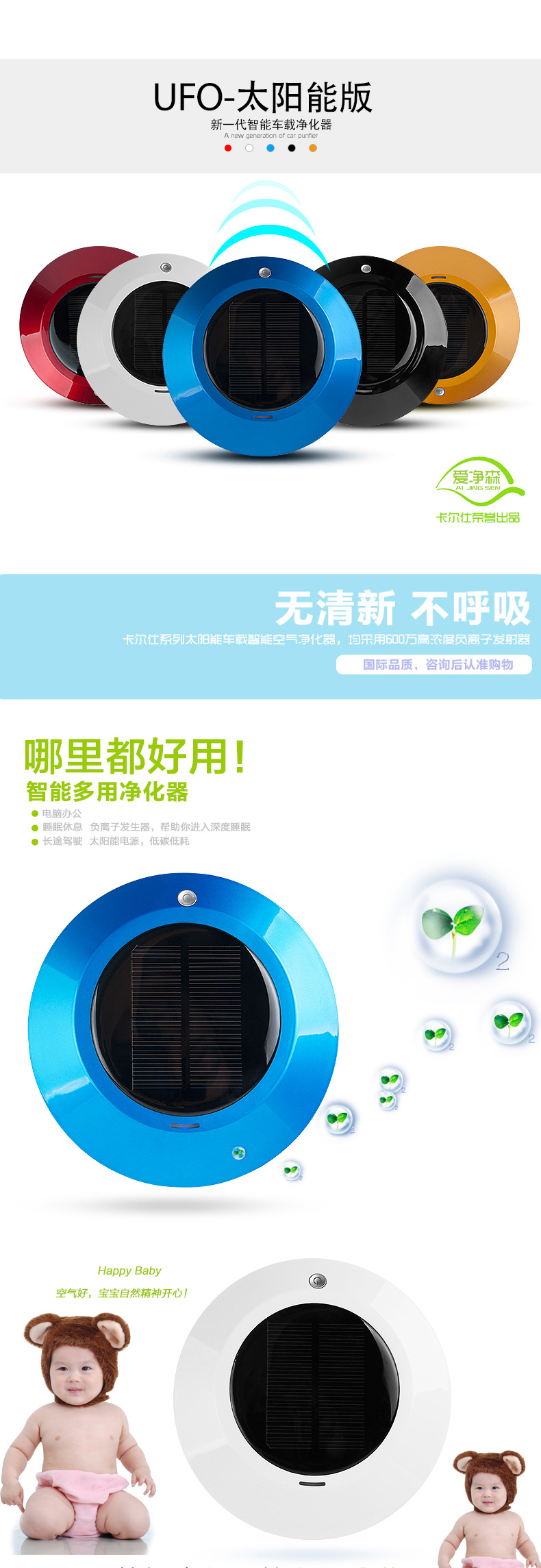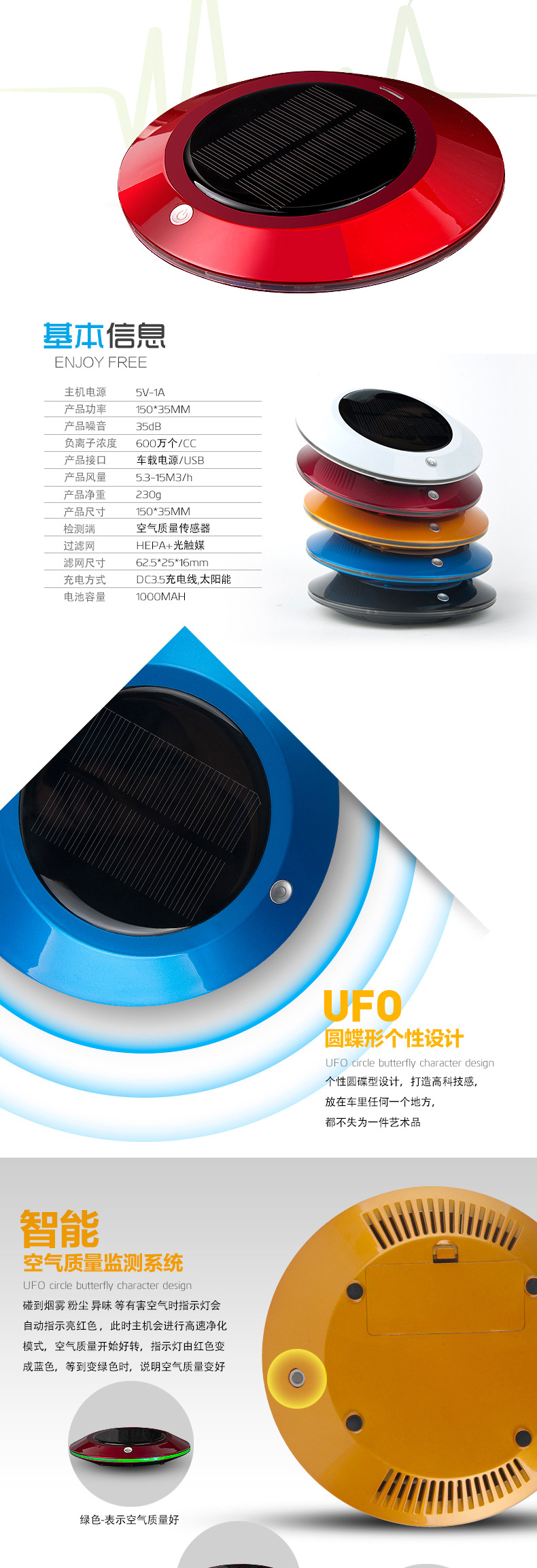 本款产品为全智能自动监测空气质量,根据空气质量优劣自动工作,大功率太阳能供电系统及 DC5V2套供电智能转换.LEDF放光显示,超大空气循环,净化洁净空气,杀灭病菌生态式根源脑保健,促进新陈代谢,调节神经机能,达到消除疲劳,缓解精神压力和急躁情绪等功效。让你的爱车,居室和办公室24小时清爽舒适。也有效保障了你的健康。