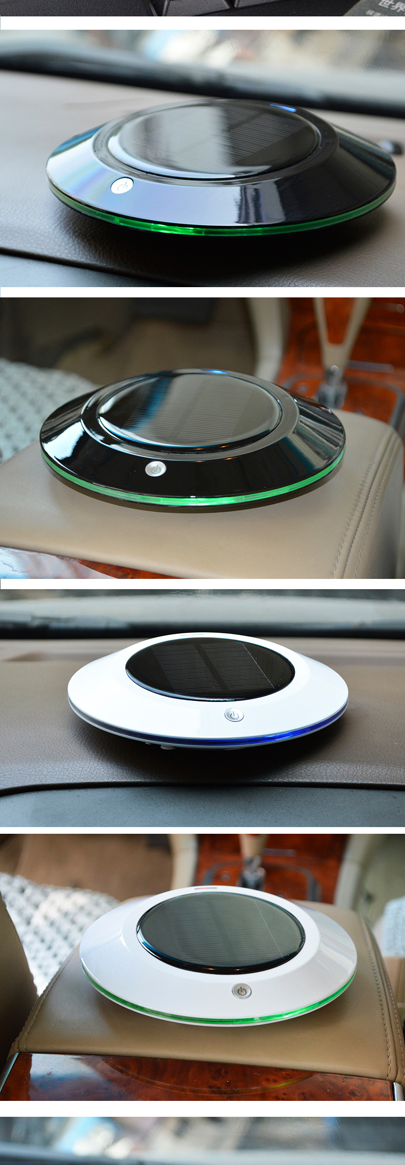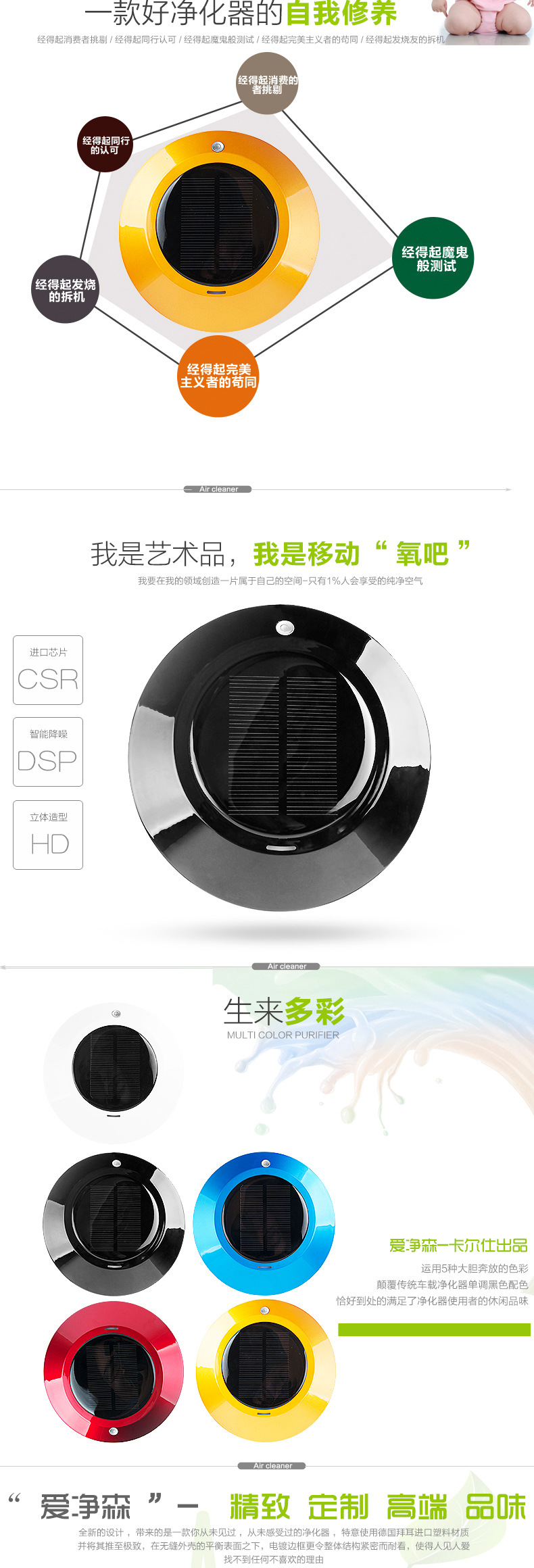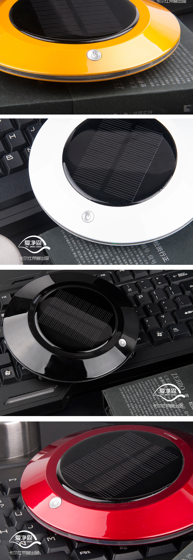 本款产品为全智能自动监测空气质量,根据空气质量优劣自动工作,大功率太阳能供电系统及 DC5V2套供电智能转换.LEDF放光显示,超大空气循环,净化洁净空气,杀灭病菌生态式根源脑保健,促进新陈代谢,调节神经机能,达到消除疲劳,缓解精神压力和急躁情绪等功效。让你的爱车,居室和办公室24小时清爽舒适。也有效保障了你的健康。