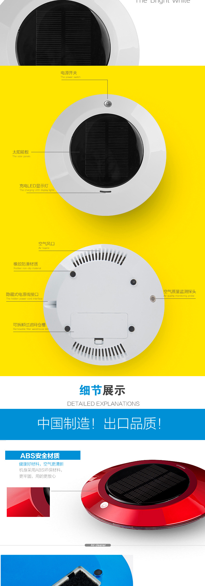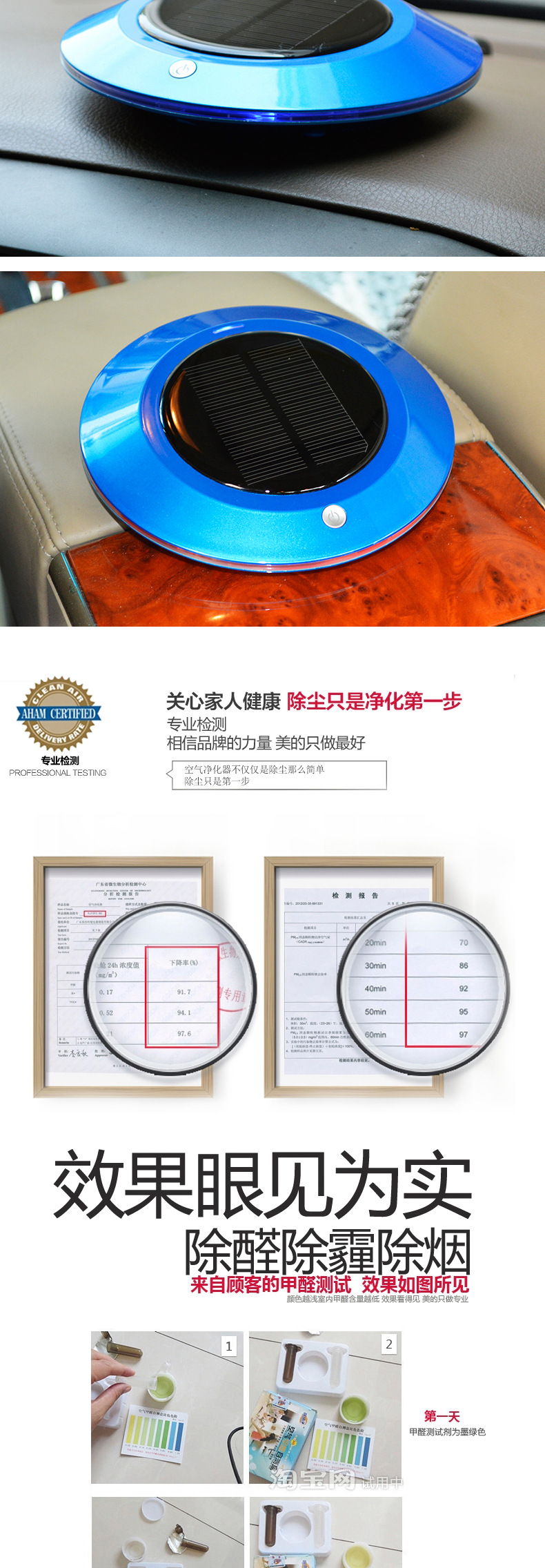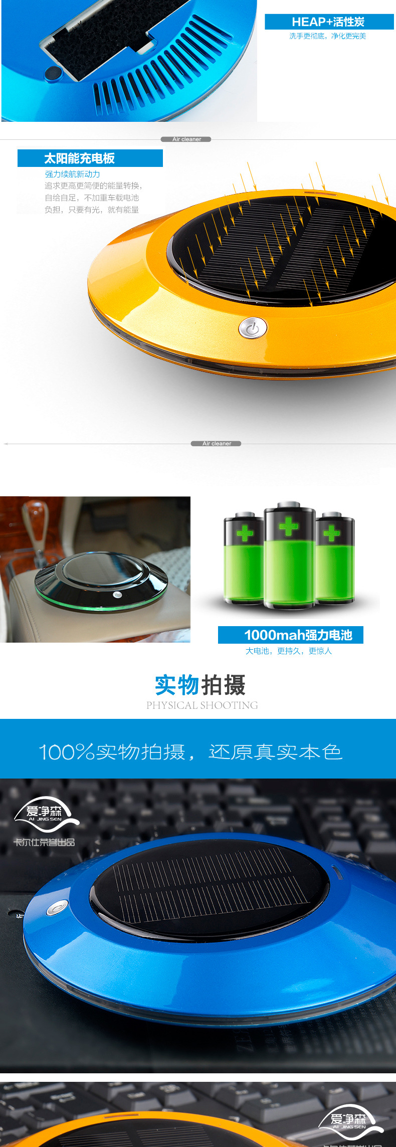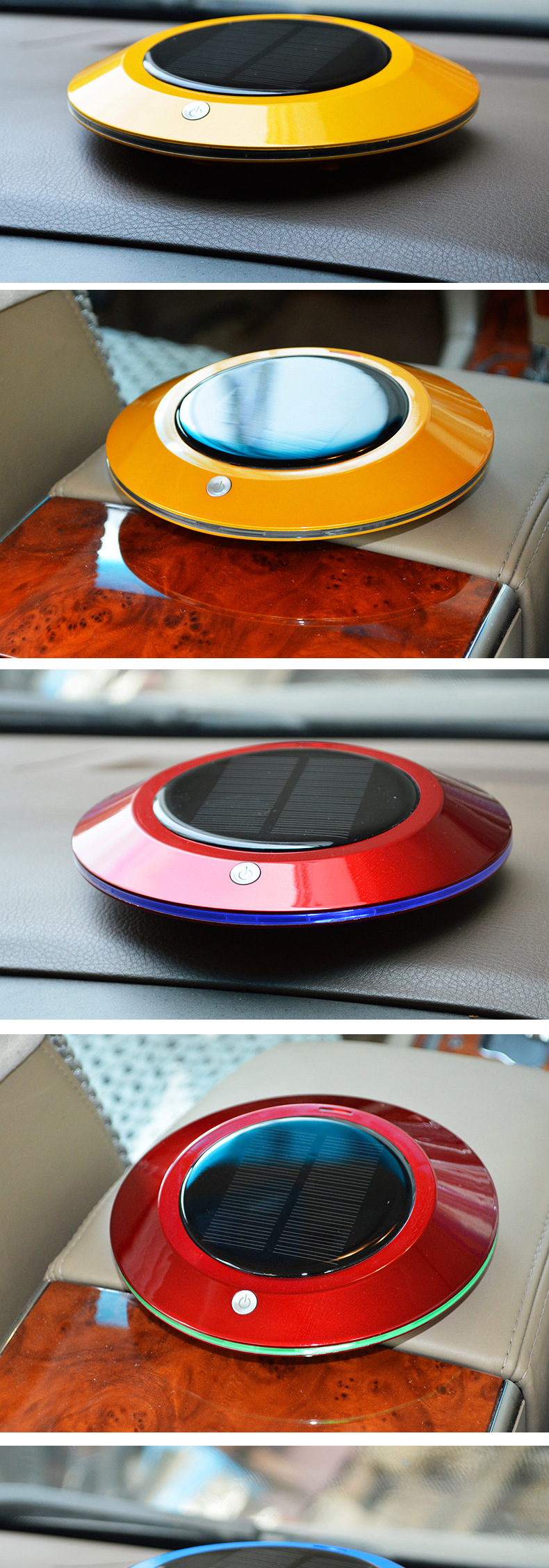 本款产品为全智能自动监测空气质量,根据空气质量优劣自动工作,大功率太阳能供电系统及 DC5V2套供电智能转换.LEDF放光显示,超大空气循环,净化洁净空气,杀灭病菌生态式根源脑保健,促进新陈代谢,调节神经机能,达到消除疲劳,缓解精神压力和急躁情绪等功效。让你的爱车,居室和办公室24小时清爽舒适。也有效保障了你的健康。