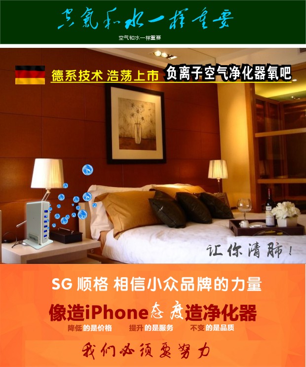 改善睡眠:经负氧离子作用,可使人精神振奋,工作效率提高,还可改善睡眠。杀菌功能:负离子发生器在产生大量负离子的同时会产生微量臭氧,二者合一更易吸附各种病毒、细菌,使其产生结构的改变或能量的转移,导致其死亡。除尘灭菌,减轻二手烟危害更有效。环保健康看得见。