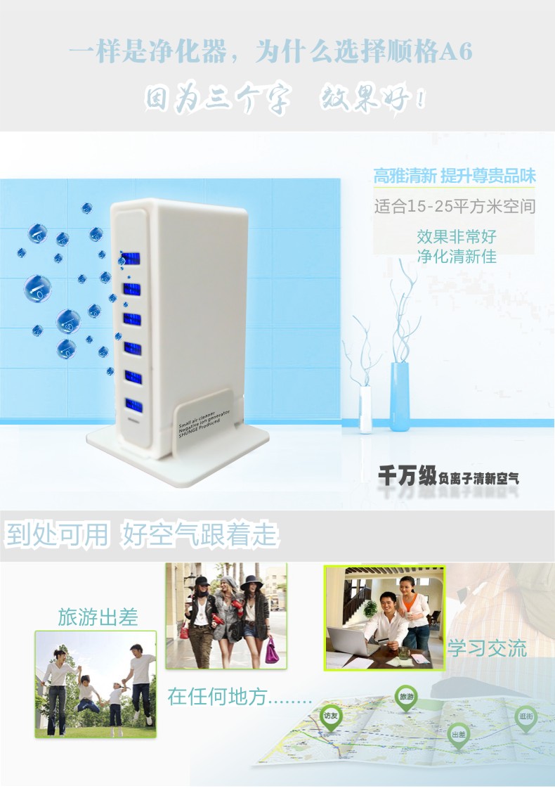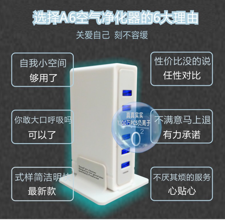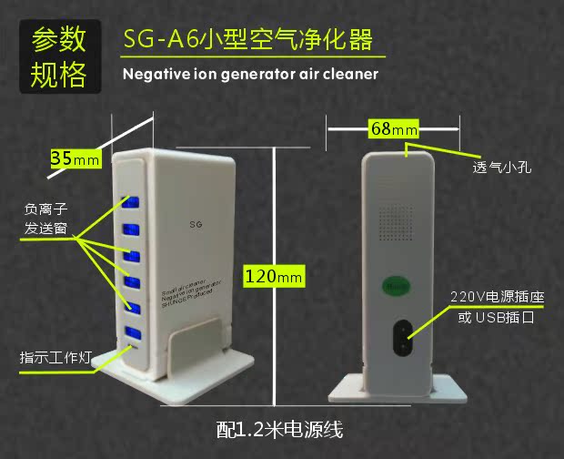 型 号:SG-A6国标及美规 规 格:120mmX65mmX50mm 负离子量:1100万左右