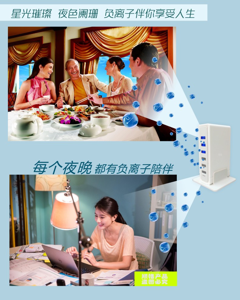 此款负离子设计非常精美!自动工作12个小时,停1-2分钟,可365天插电使用,性能更稳定,寿命更长,