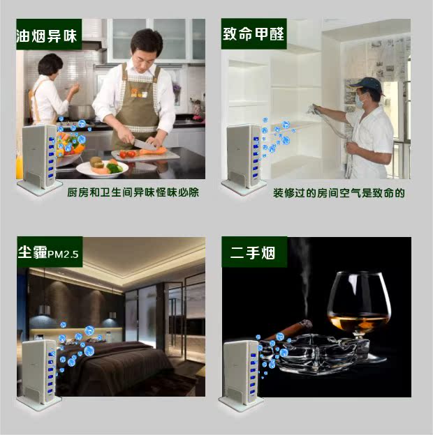 清新空气、消烟除尘:带负电荷的负离子与漂浮在空气中带正电荷的烟雾粉尘进行电极中和,使其自然沉积。