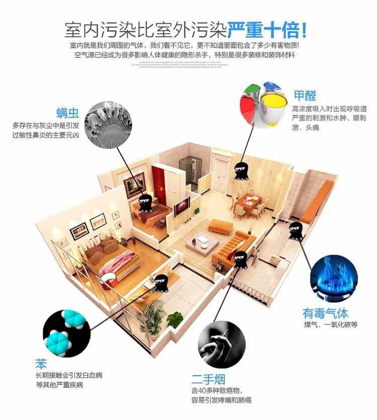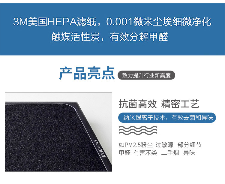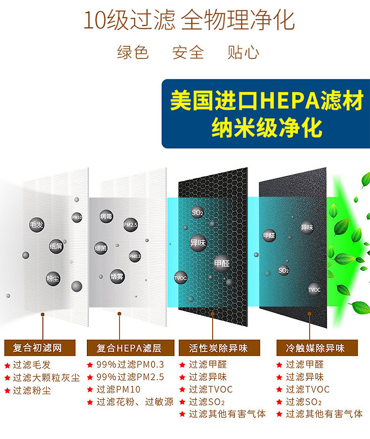 它能够过滤99.7%以上0.1微米级的细小颗粒。滤除大多数的细菌、花粉孢子、烟等烟雾和尘埃。而且可自然杀菌和清除各种病毒