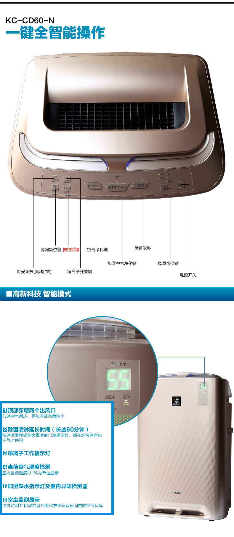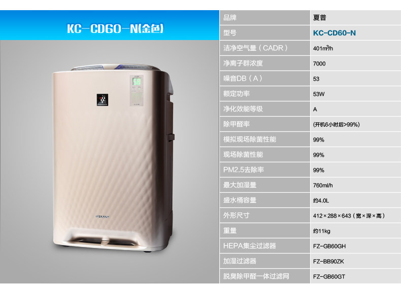 [弘林科技空气净化,氧吧]夏普空气净化器家用KC-CD60-N月销量0件仅售1180元