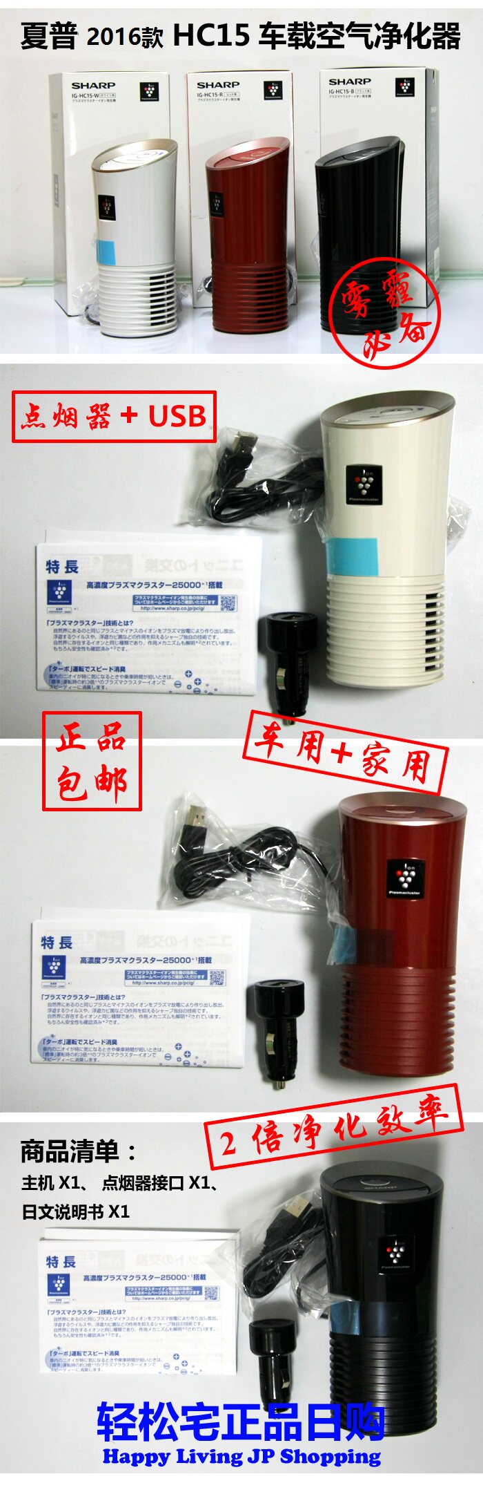 日本夏普车载空气净化器IG-JC15/HC15车用负离子除甲醛雾霾USB口