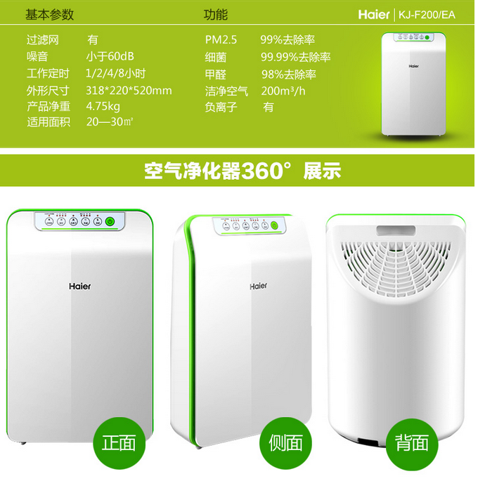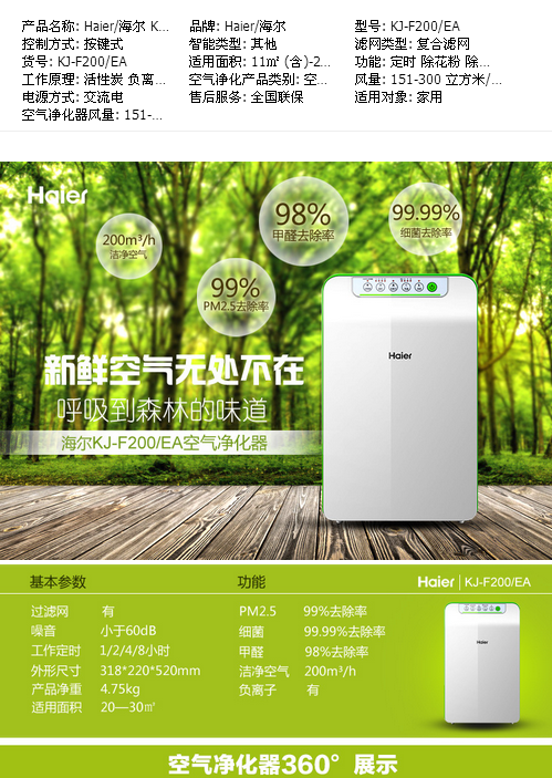 [海尔净水批发空气净化,氧吧]海尔 KJ-F200/EA空气净化器月销量0件仅售1699元