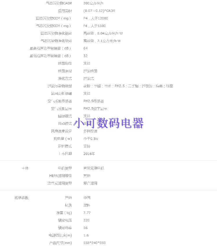 • 功能:定时 除VOC 除花粉 除颗粒物 除甲醛 除烟除尘