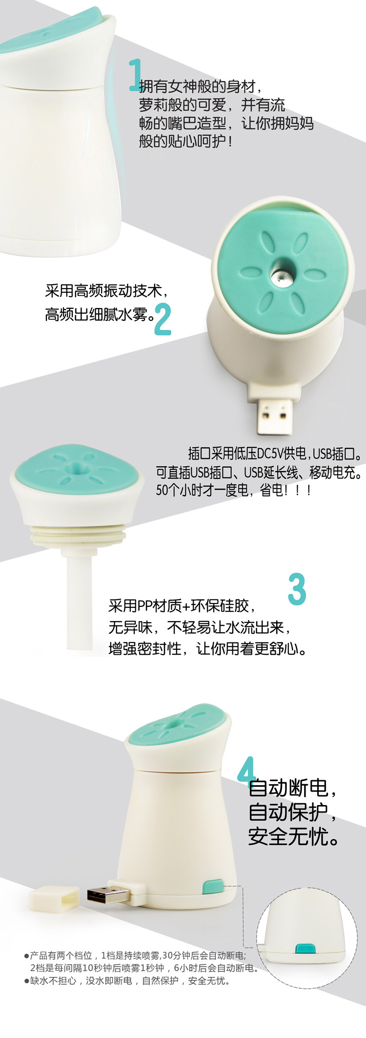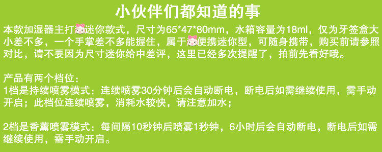 第1档:开机按第一下,持续喷雾,30分钟后自动断电,适合加湿