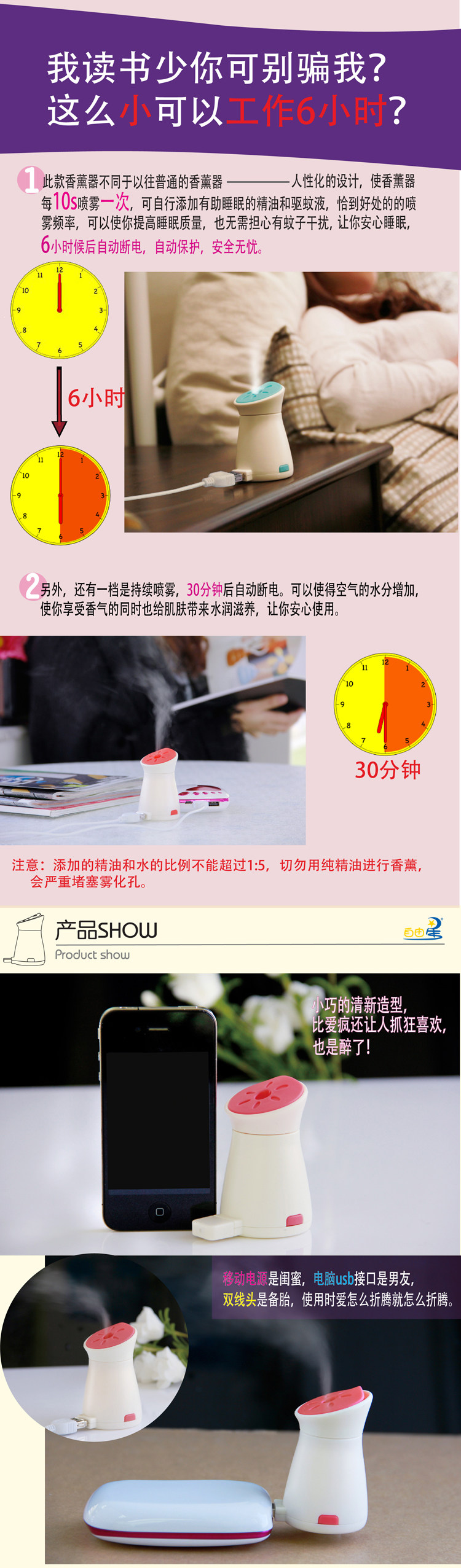 第2档:开机按第二下,10秒喷雾一次,恰到好处的喷雾频率;6小时后自动断电,适合香薰和驱蚊
