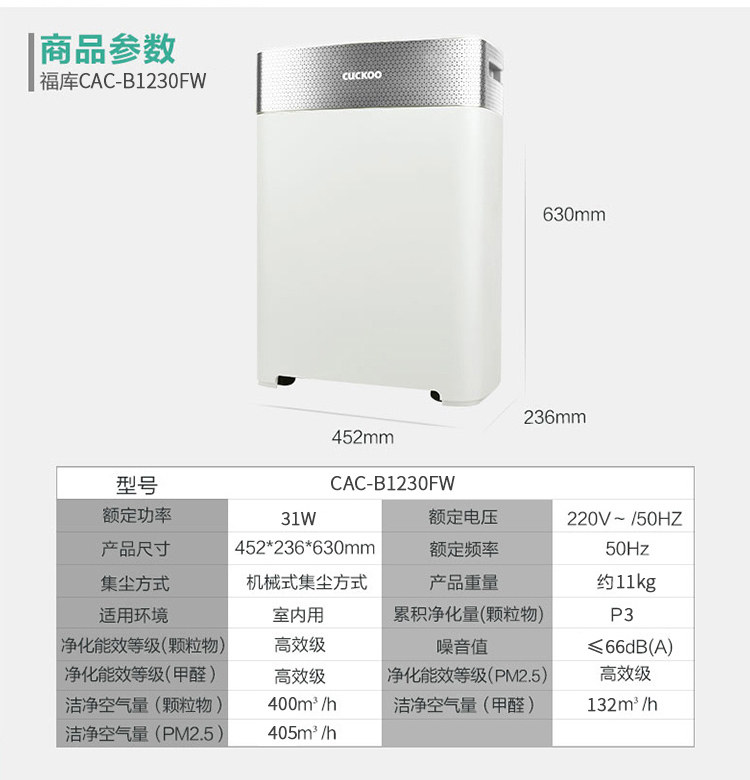 CUCKOO/福库 CAC-B1230FW韩国原装进口除甲醛除PM2.5空气净化器