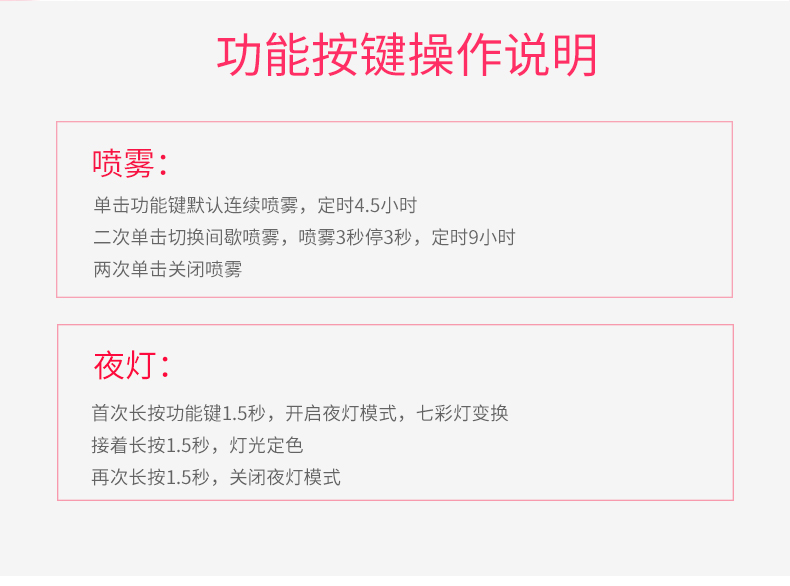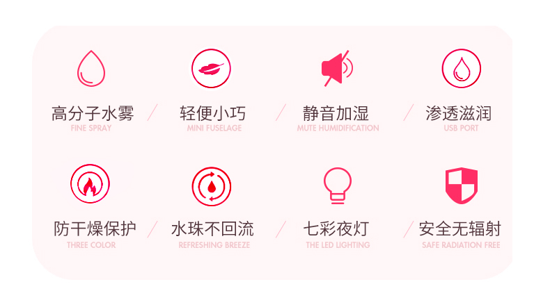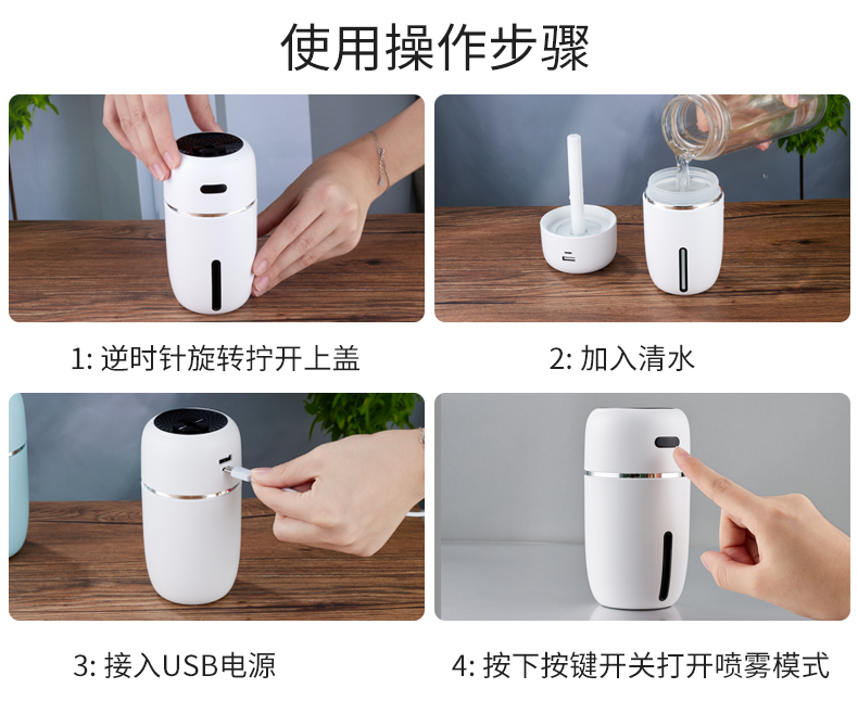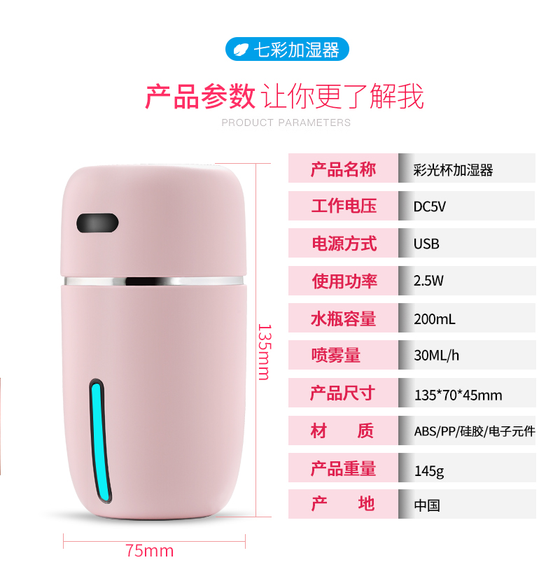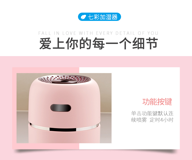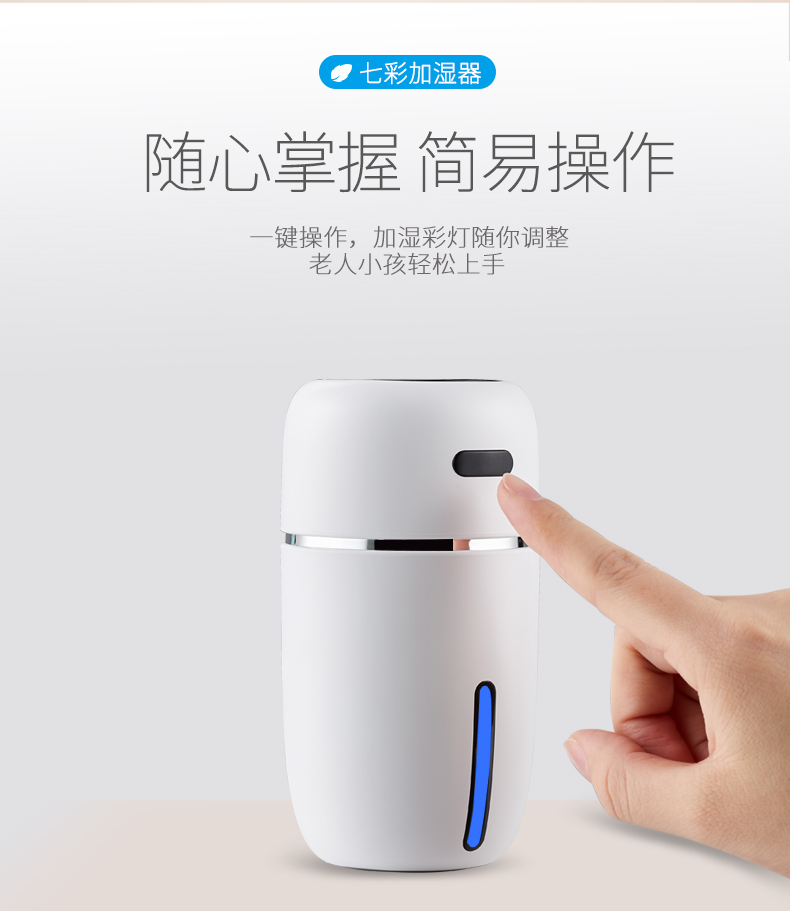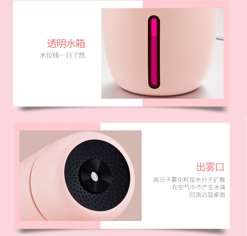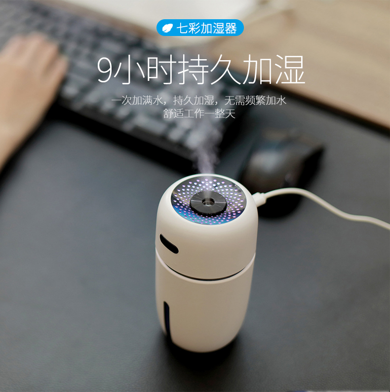 不占地方效果很好,还有暖色小夜灯很好看,密封性也好,不管在哪里都是可以喷雾的,装满水就可以开始使用,有间接性喷雾,而且这个加湿器外观也超级可爱,我是一到秋冬皮肤比较干燥,这个加湿器用着超级合适