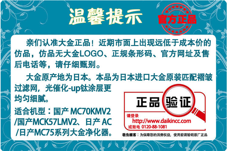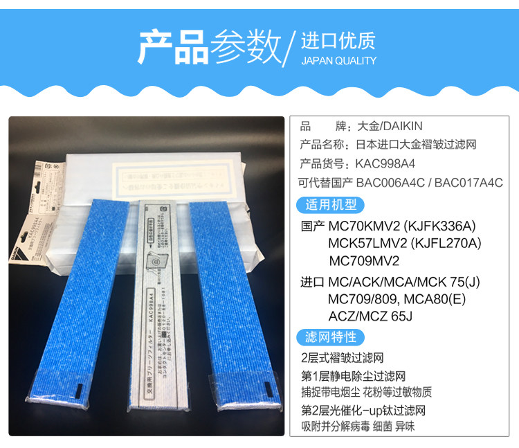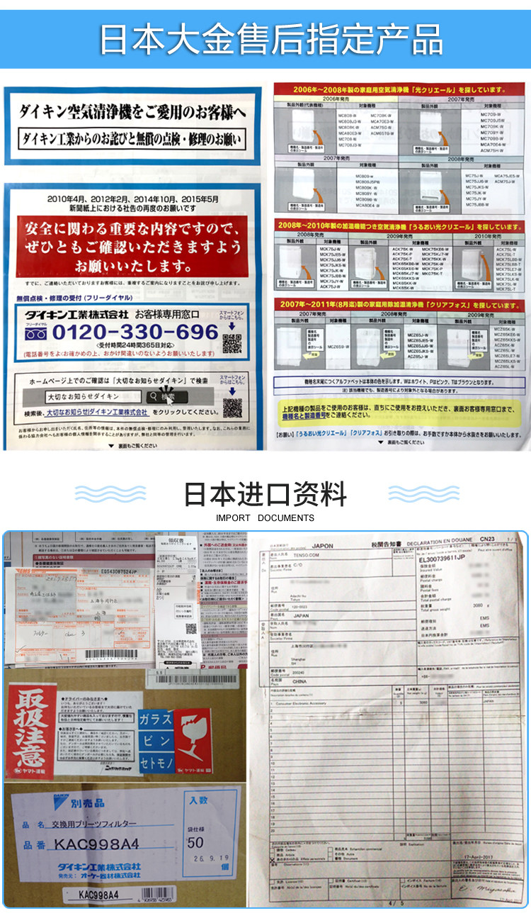 本店为大金正品专卖店,只售品牌原装正品,大金净化器配件及耗材分日本大金原装进口及国内大金供货。大金国产一盒5片装,日本进口1包7片装。均为大金厂家原装专柜正品。请放心购买。进口滤网更细腻严实,经检验,去除PM2.5效果更好。