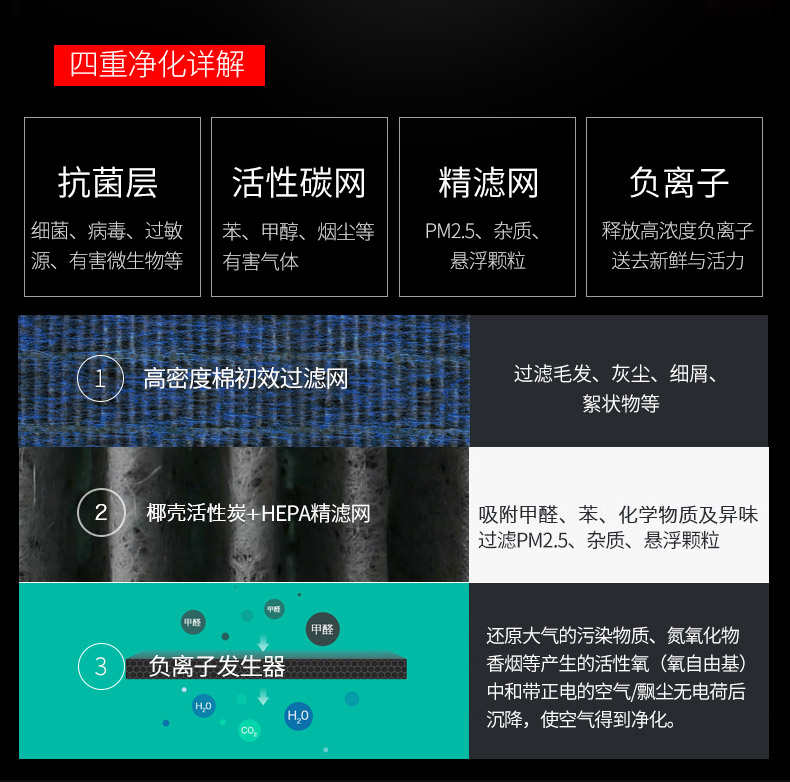 • 净化原理:HEPA滤网活性炭负离子静电吸附