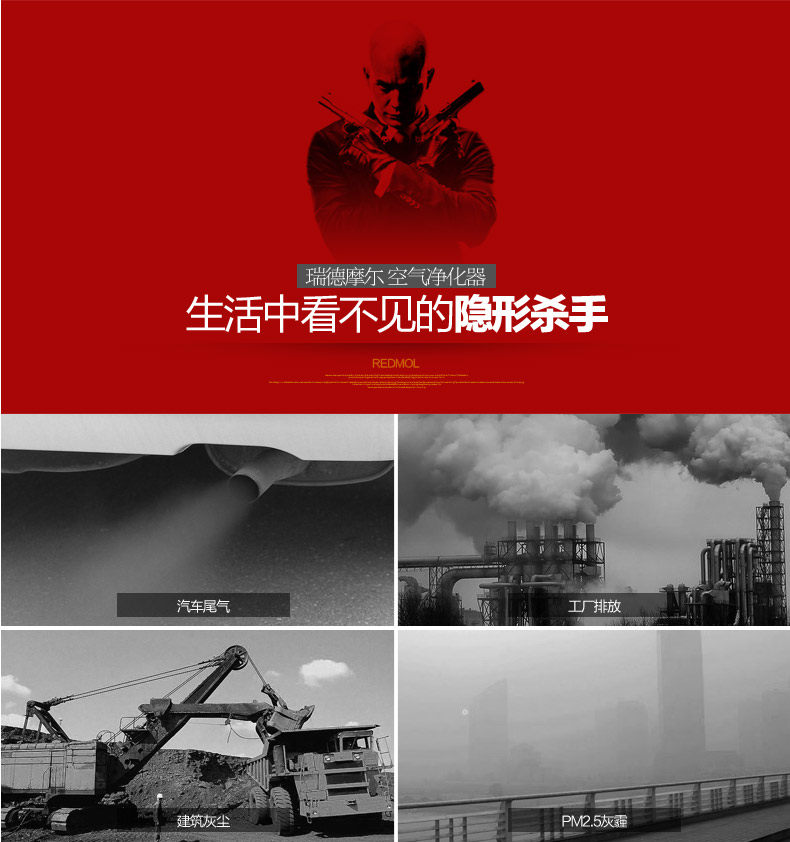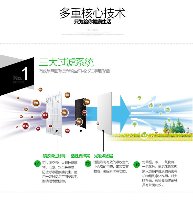 • 工作原理:活性炭 负离子 臭氧 紫外线 光触媒