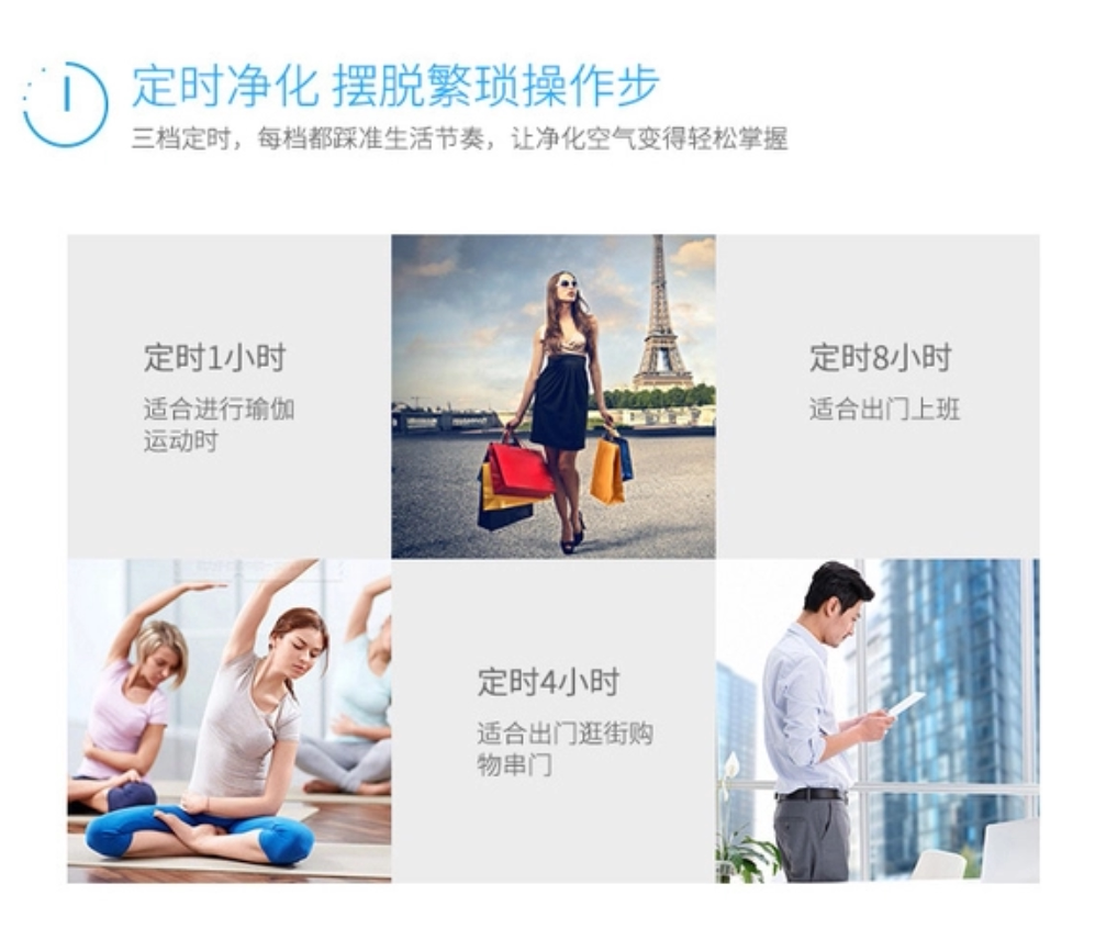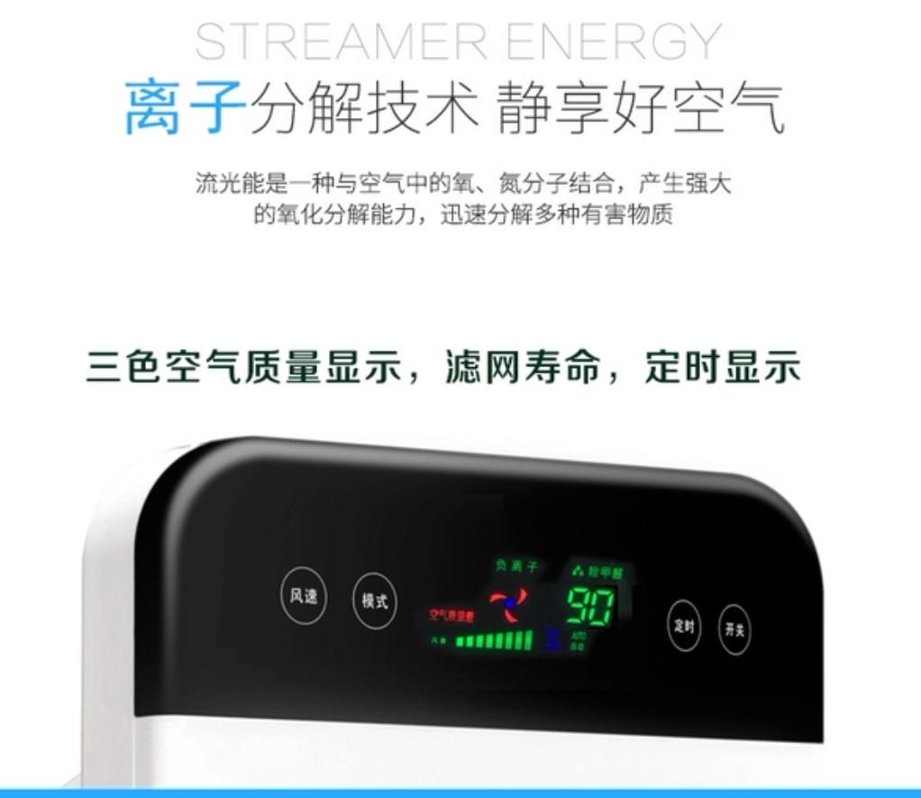 • 功能:定时 除花粉 除颗粒物 除甲醛 除烟除尘 加氧 除雾霾 除菌, 负离子 除菌