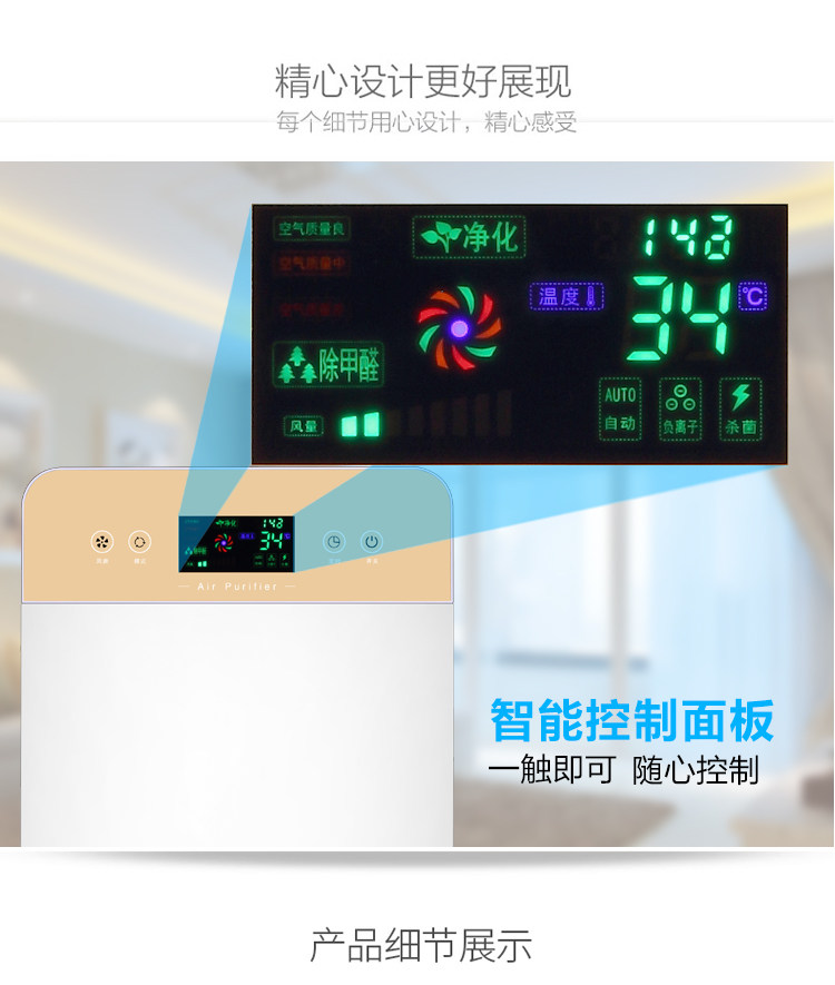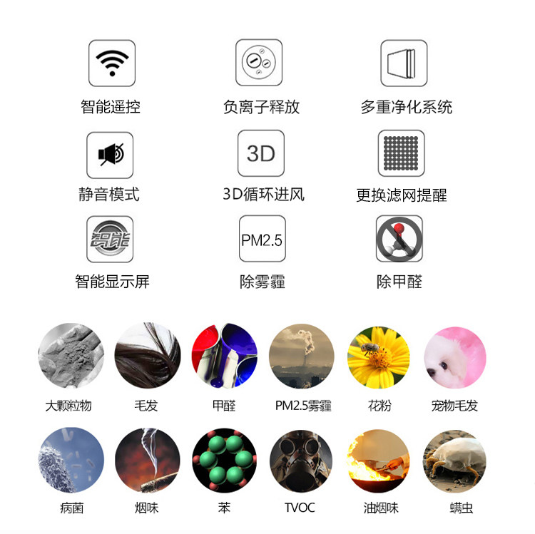 • 功能:定时 除花粉 除颗粒物 除甲醛 除烟除尘 杀菌 除雾霾