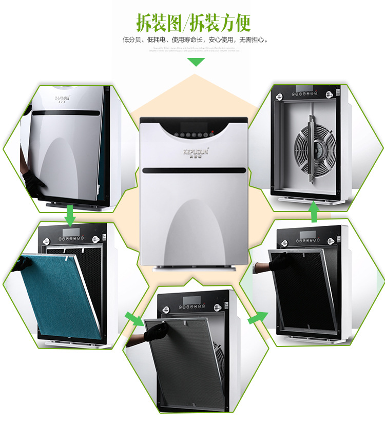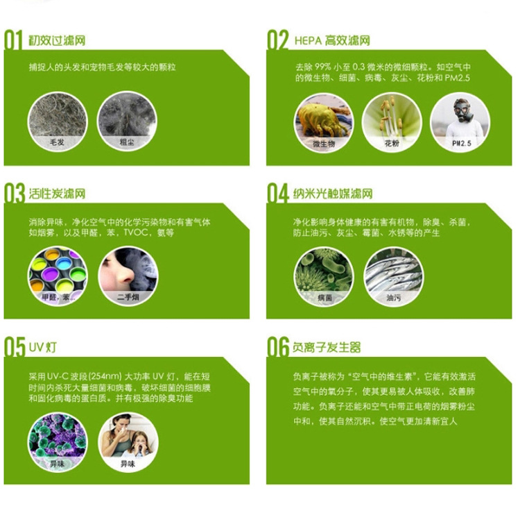 • 工作原理:活性炭负离子等离子HEPA技术臭氧紫外线光触媒
