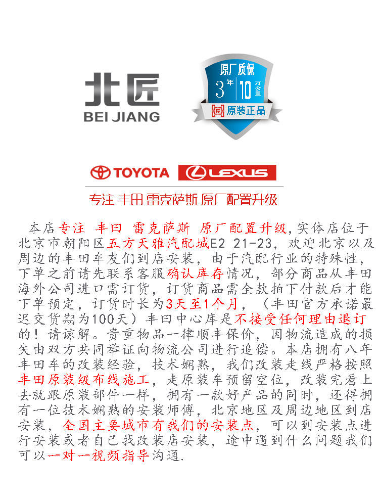 • 颜色分类:锐志 塞纳 RAV4荣放 雷克萨斯 凯美瑞 卡罗拉 皇冠 普拉多 酷路泽 雷凌 汉兰达 普瑞维亚 奕泽CHR 总成(不带开关) 总成+线束(不带开关)