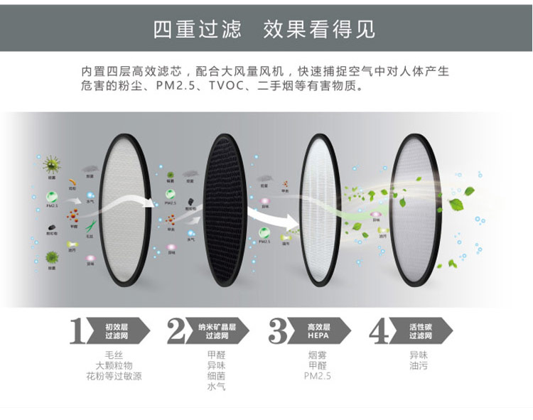 • 净化原理:HEPA滤网 活性炭 静电吸附