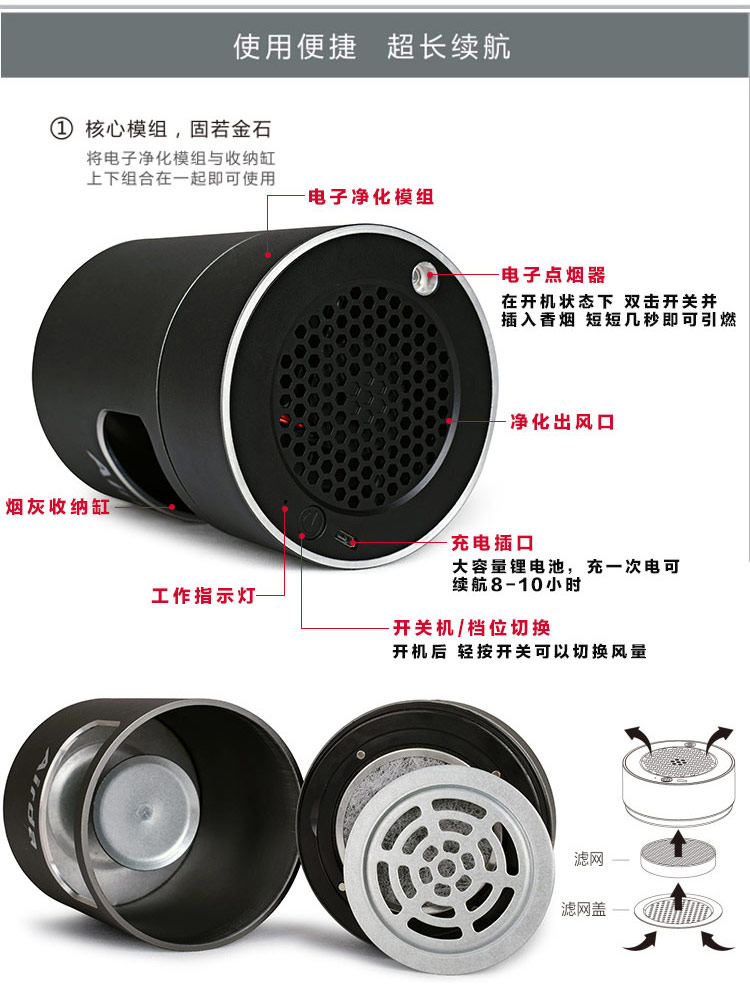 烟灰缸空气净化器空气净化特级滤芯纳米晶体吸附杀菌快速除烟除味