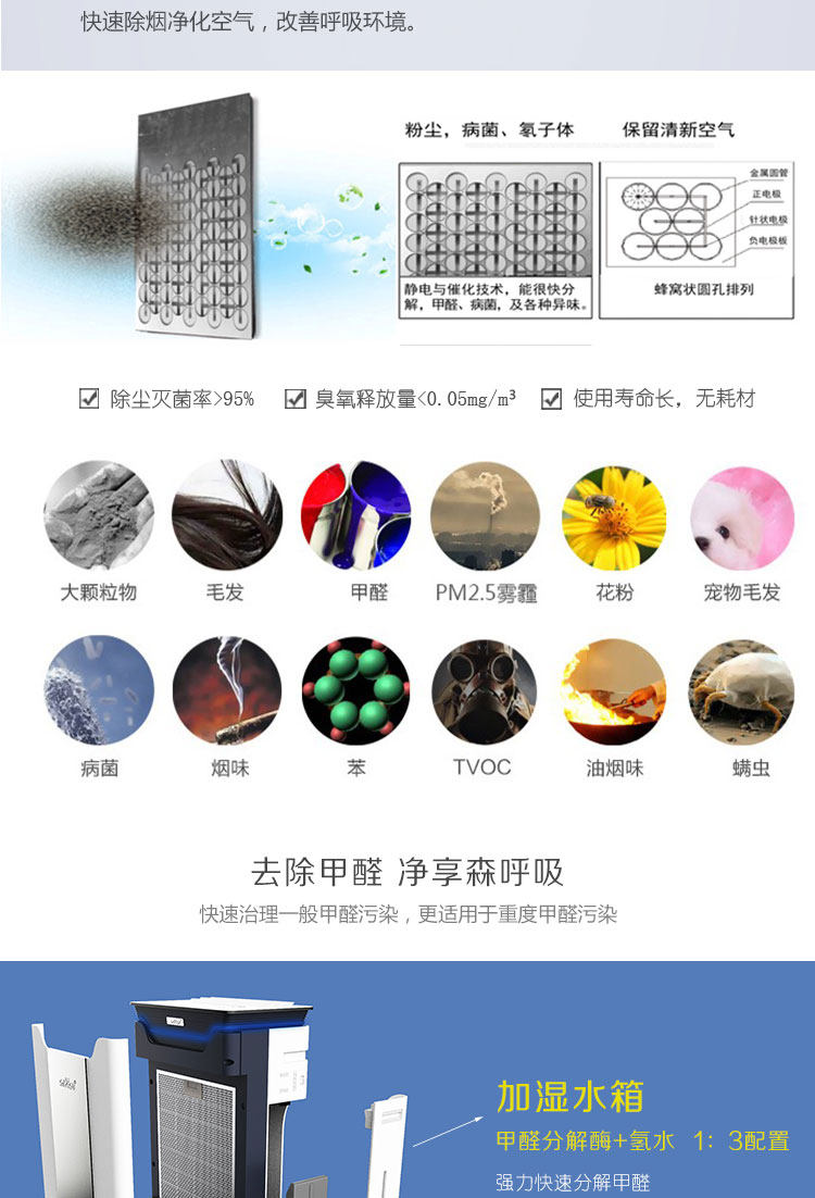 • 工作原理:HEPASilent专利技术 静电技术 活性炭 负离子 等离子 HEPA技术 臭氧 紫外线 光触媒