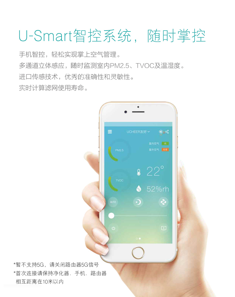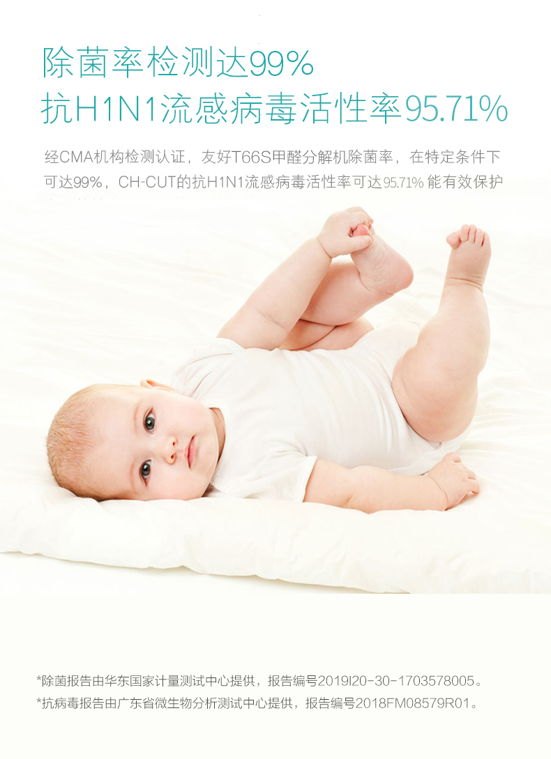 在朋友那里知道友好的大名,据说入了美国well标准,应该可以信任。买了t50和新款T70,这台新款就由我来第一个试用吧,初步体验不错,在小房间开了半天,气味明显小了。除甲醛性能还没法评价,过段时间找机构测一下再来追评。谢谢客服小哥的周到服务!