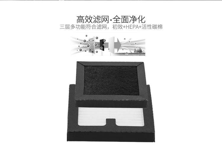• 净化原理:HEPA滤网 光触媒 活性炭 等离子 负离子 静电吸附