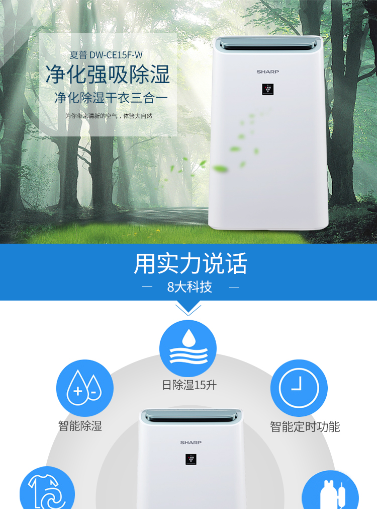 夏普除湿机家用干衣卧室空气净化器除湿器DW-CE15F-W地下室抽湿机
