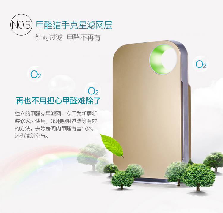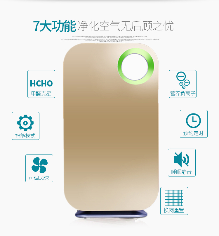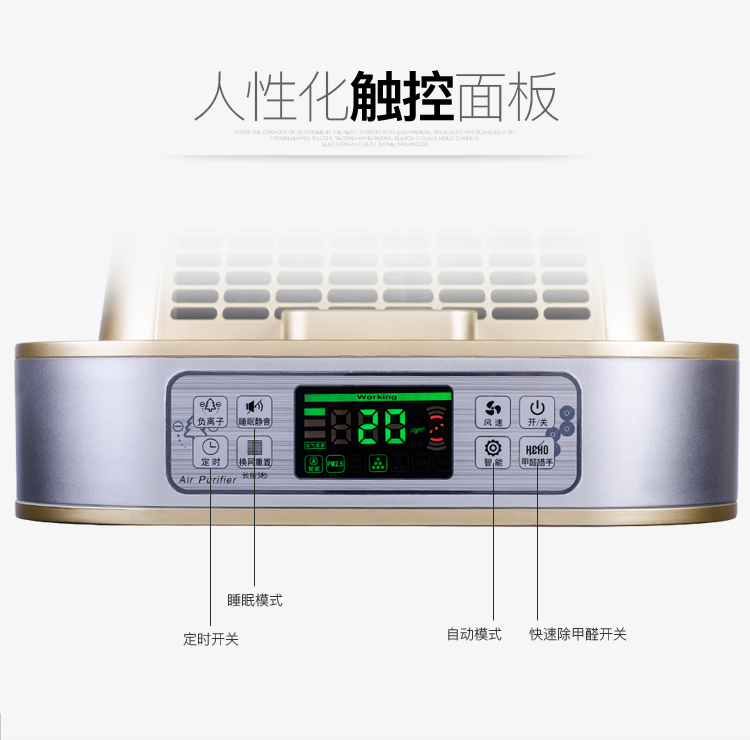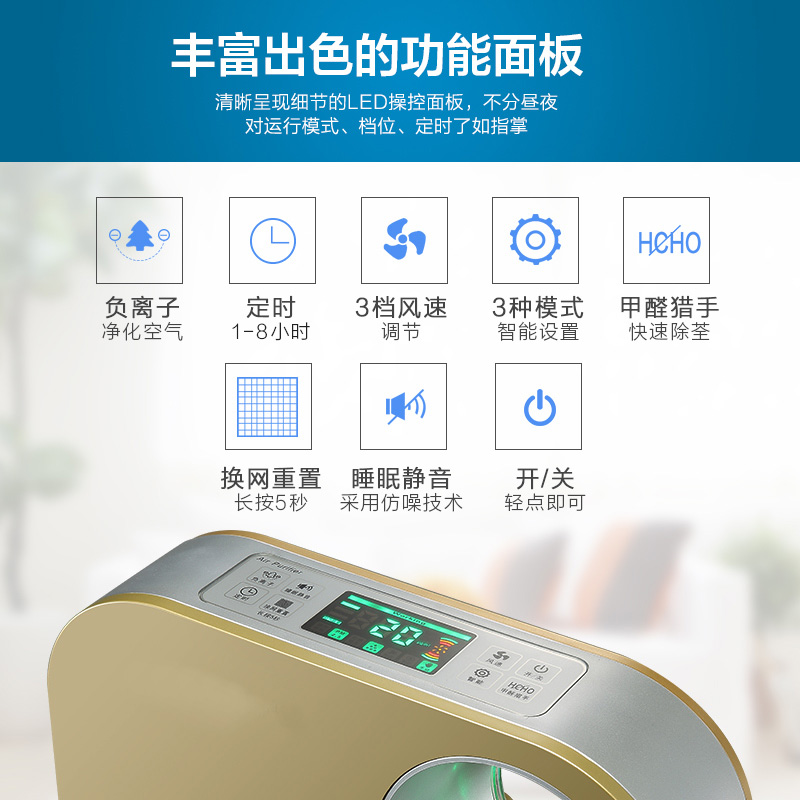 • 功能:定时 除颗粒物 除甲醛 除烟除尘 杀菌 除雾霾 除菌, 负离子 除菌