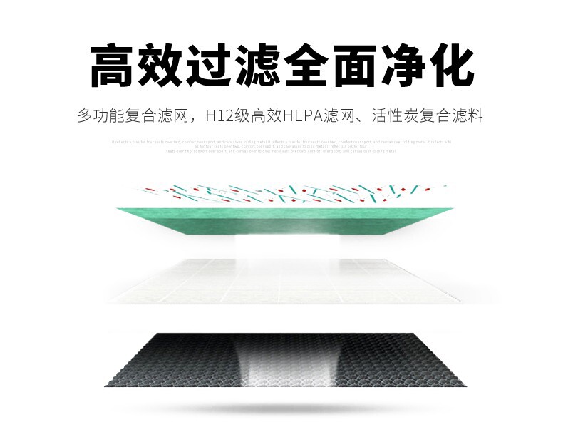 4. 高效纳米杀菌涂层板,多重过滤系统:活性炭过滤层+光触媒过滤层。