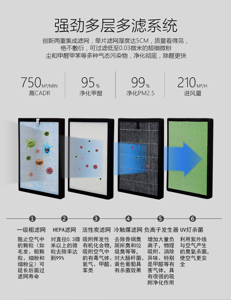 • 工作原理:活性炭 负离子 HEPA技术 臭氧 光触媒