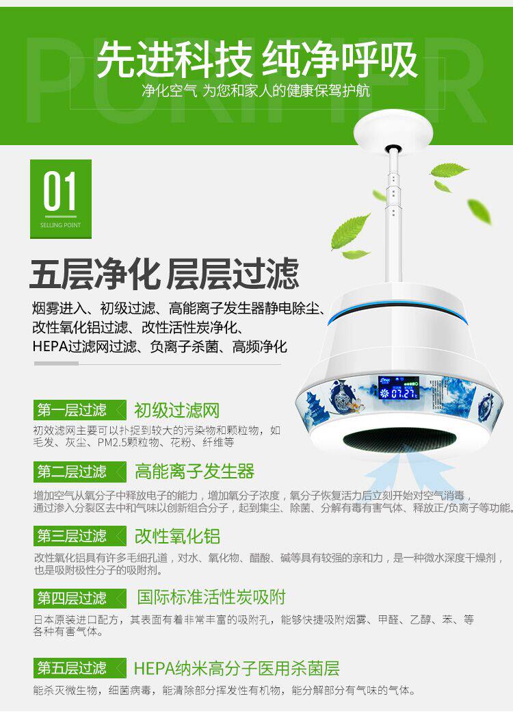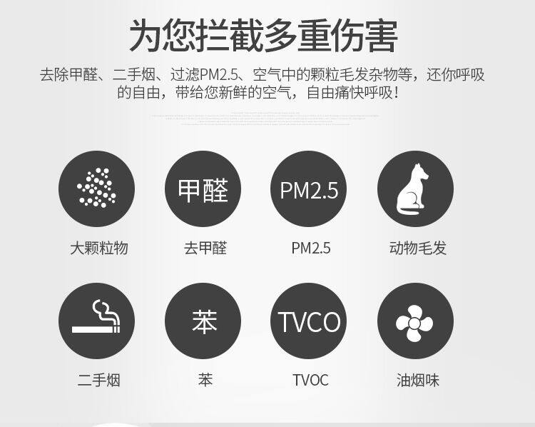 • 功能:除花粉 除颗粒物 除甲醛 除烟除尘 杀菌 除雾霾 除菌, 负离子 除菌