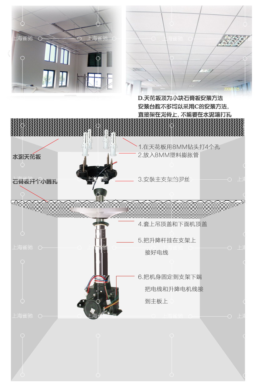 下图为石膏板的吊顶,是小块的可拆卸,如果要安装多台净化器,怕吊顶不能承受,可以选择安装到天花水泥板上,把升降杆穿过中间石膏板的吊顶,但要天花板的高度会不会太高。太高可以选上面C的方法。