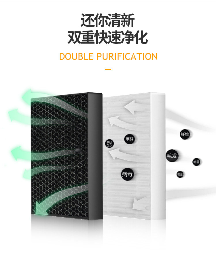 • 净化原理:HEPA滤网 光触媒 活性炭 等离子 臭氧 负离子 静电吸附