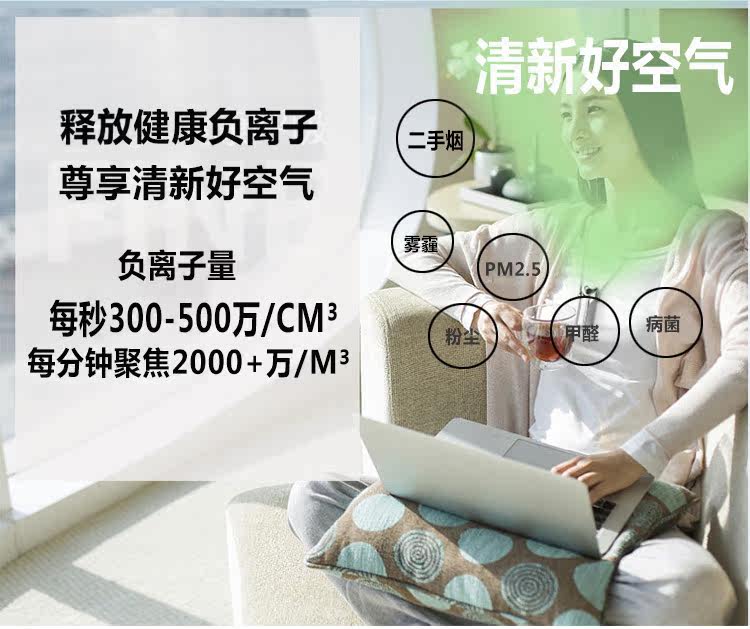 • 功能:除花粉 除颗粒物 除甲醛 除烟除尘 杀菌 加氧 除雾霾 除菌, 负离子 除菌