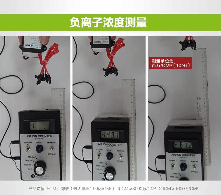 负离子浓度实测:5cm处测试>2亿以上;10cm处>1亿4000万以上;20cm处>1600万。