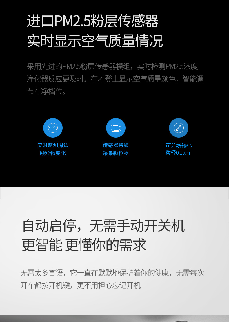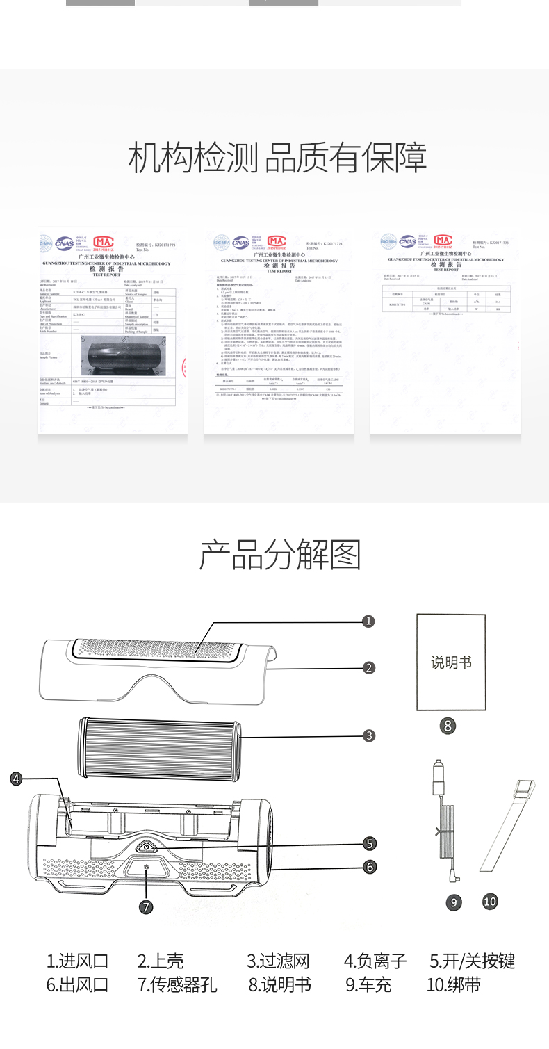 • 净化原理:HEPA滤网 光触媒 活性炭 负离子 静电吸附