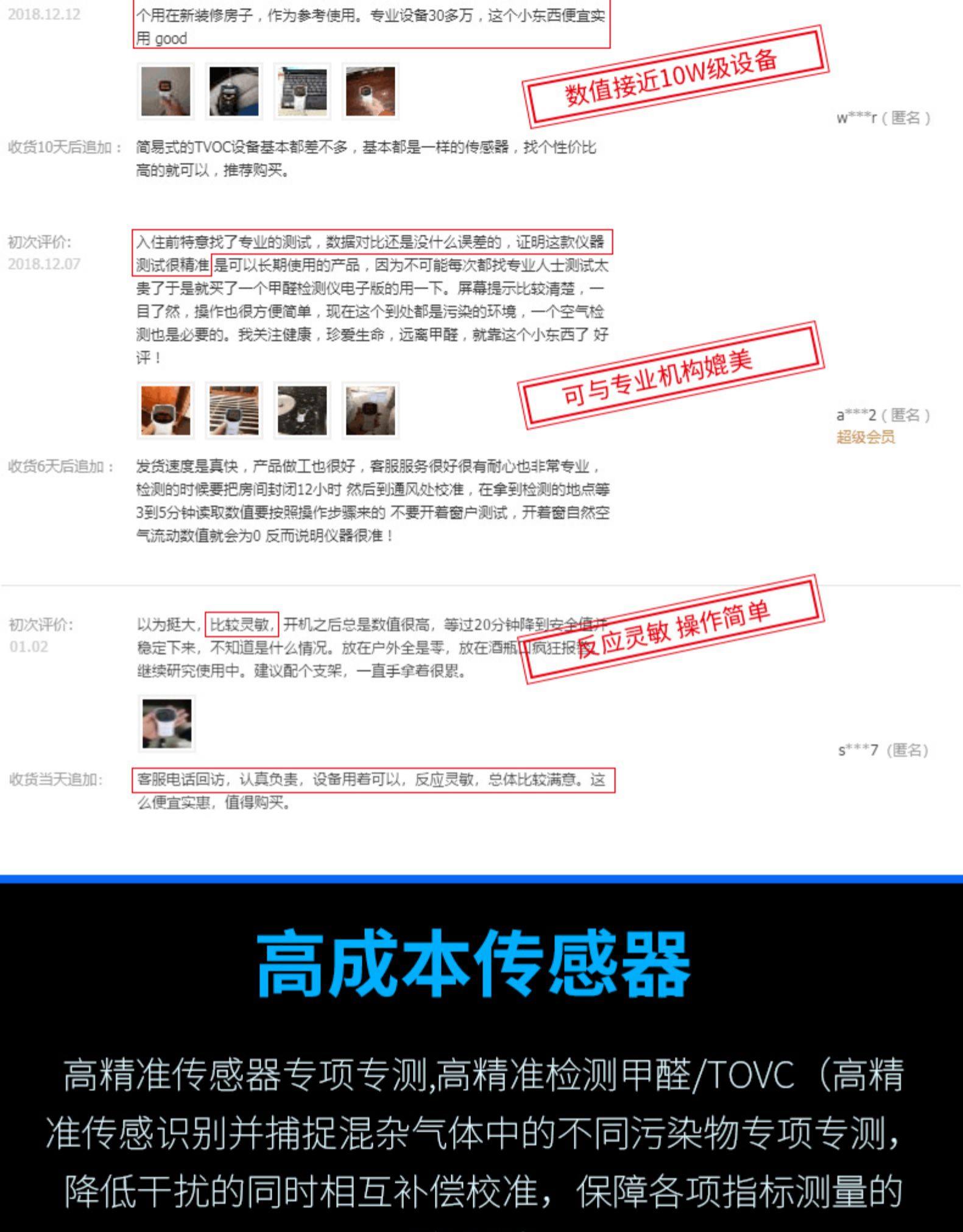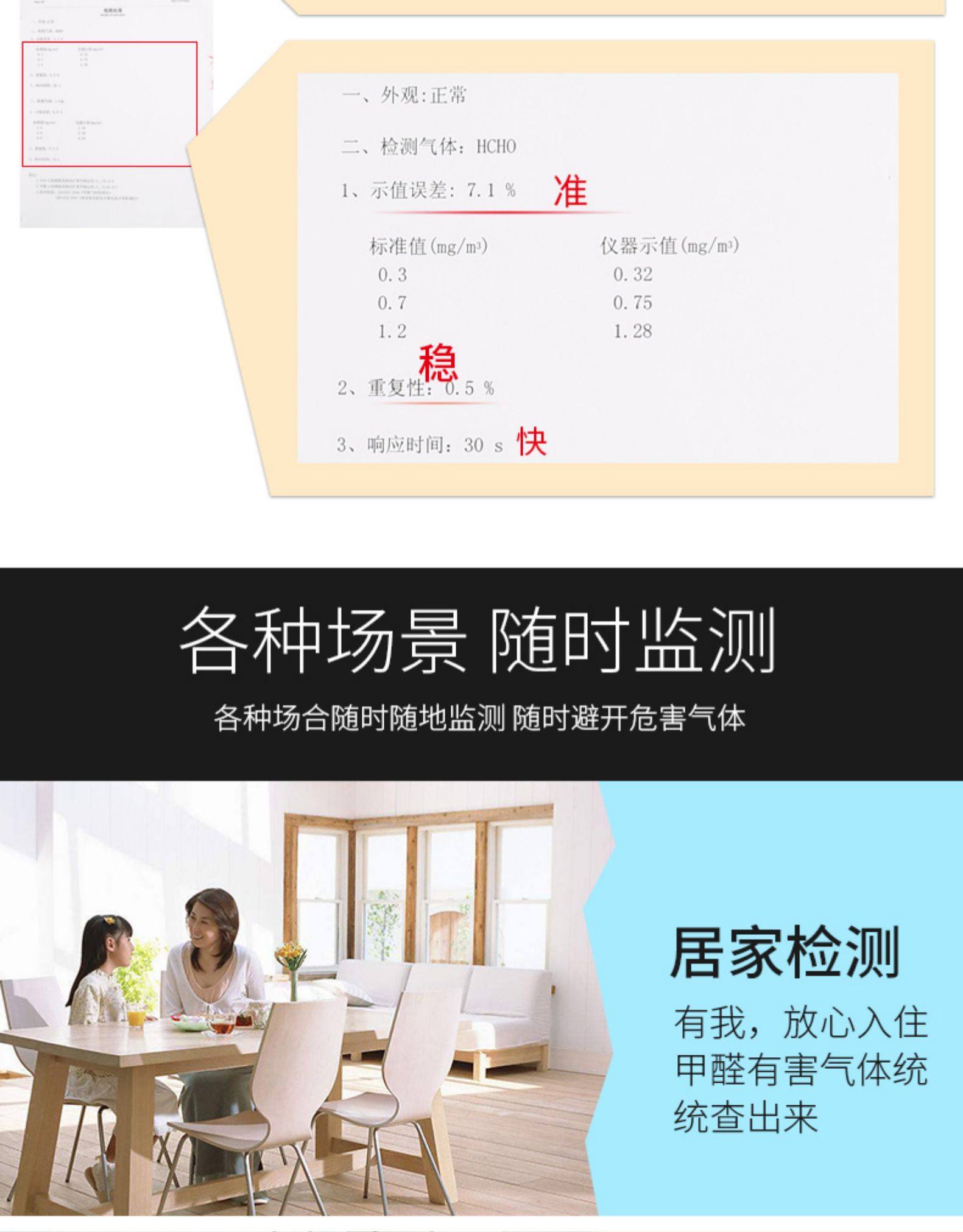 东东收到了,很惊喜,小小一个的机器,居然测得那么准确,不错,买回来我就试了下,都没有甲醛,柜子打开里面有一点,看来真是精确的,不错,不错,值得推荐,快递也很好!