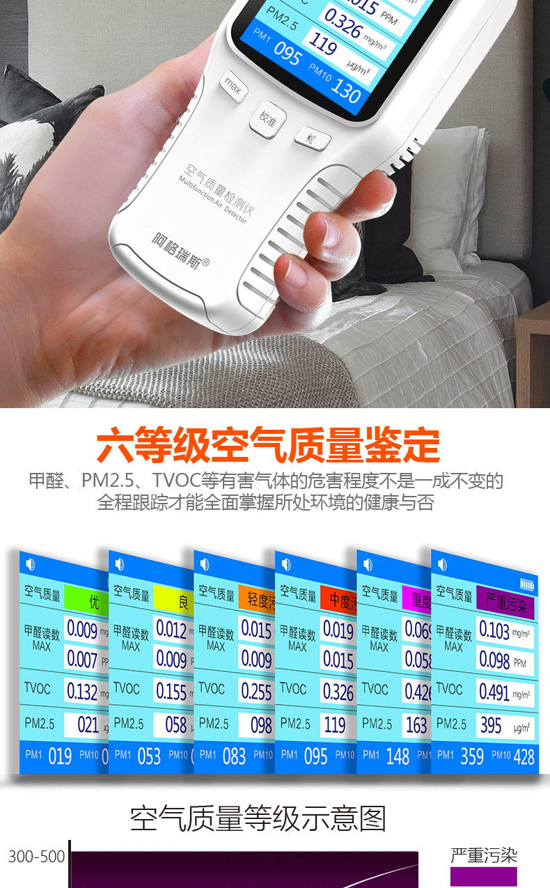 检测的很灵敏。读数快而准,使用效果也没让我失望,检测数值非常的直观。检测时在客厅通风良好的地方显示安全,房间里检测的数据还是稍微高一 点,显示空气一般, 数字显示清晰挺好辨识。看来是买对了,这个钱没有白花啊,为了家人的安全,经常测试一下还是有必要的。家里新装修了房子,请了专业的人来测,跟这个仪器测的一样,这个还比较方便,我自己拿着就可以在家里各个地方测了,操作很简单,以后有了这个多测测就可以了,现在空气一般,通风也不太好,正好买一些去甲醛的看看效果。