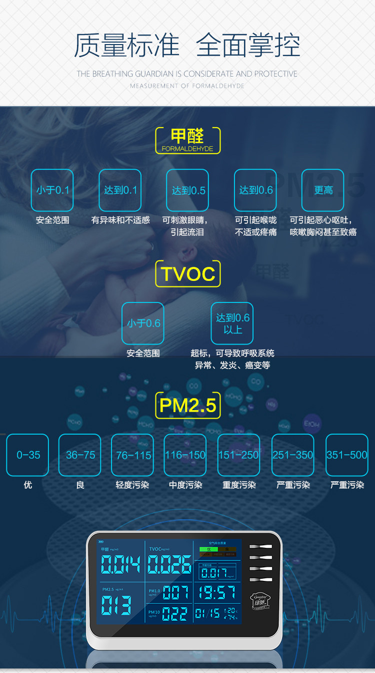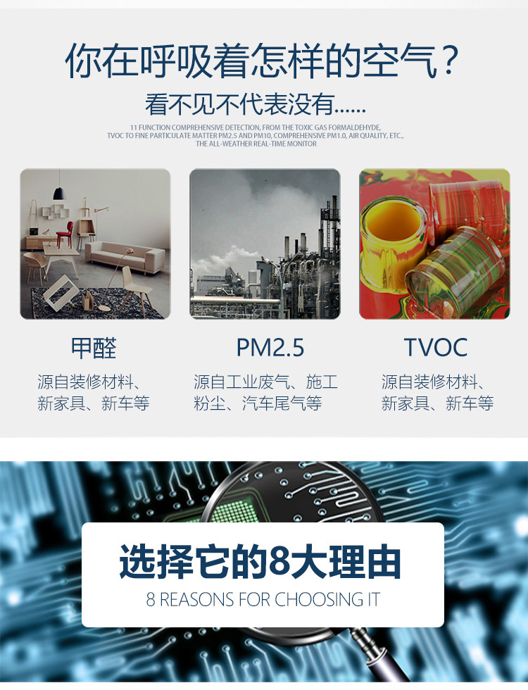 很好的空气质量测量仪器,外观大气做工精致,测量灵敏度高。以前向朋友借用过两款不同牌子的测量仪,感觉不行所以自己化钱买个好的,这个就很称心。