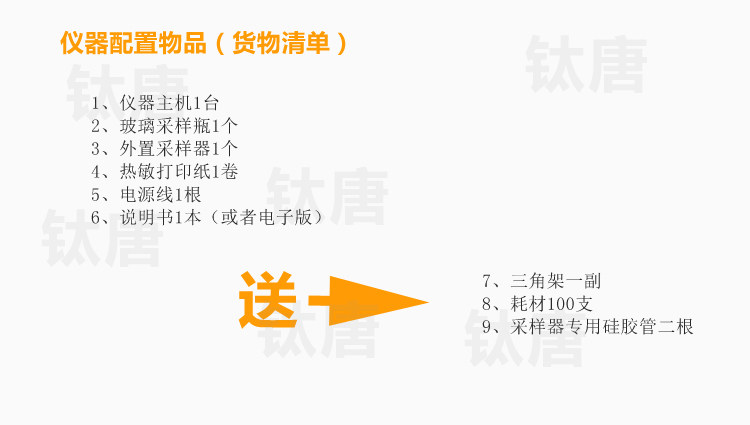 采购该检测仪可以免费赠送检测试剂100支,甲醛50支其它各10支。