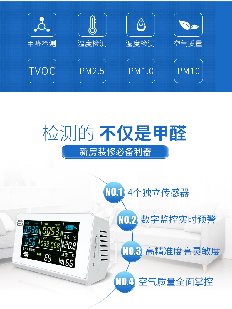 检测仪好用,放卧室里很明显就能测出来甲醛多少了,很灵敏,有了它安心多了,最起码知道有甲醛这么重可以先不搬进去住了,赞一个