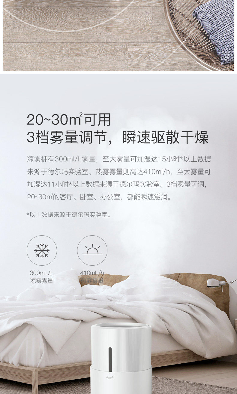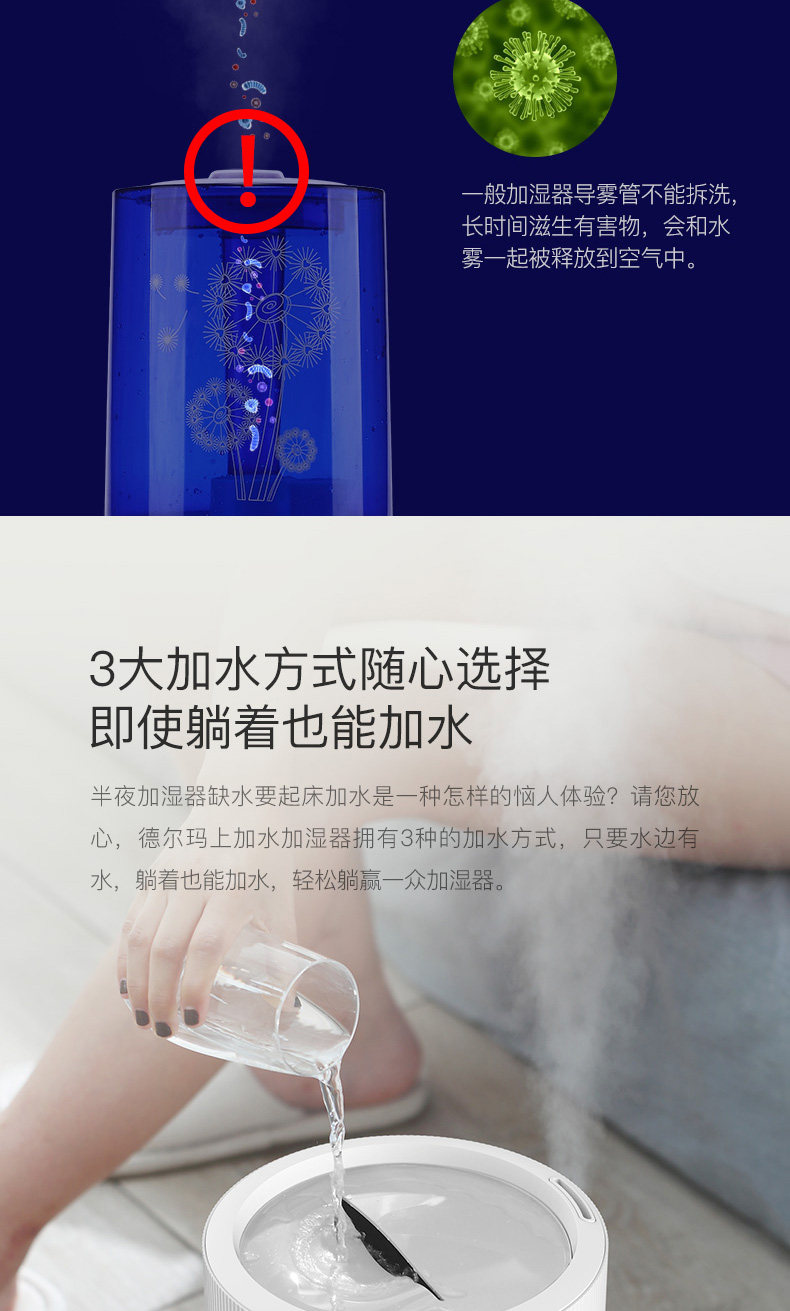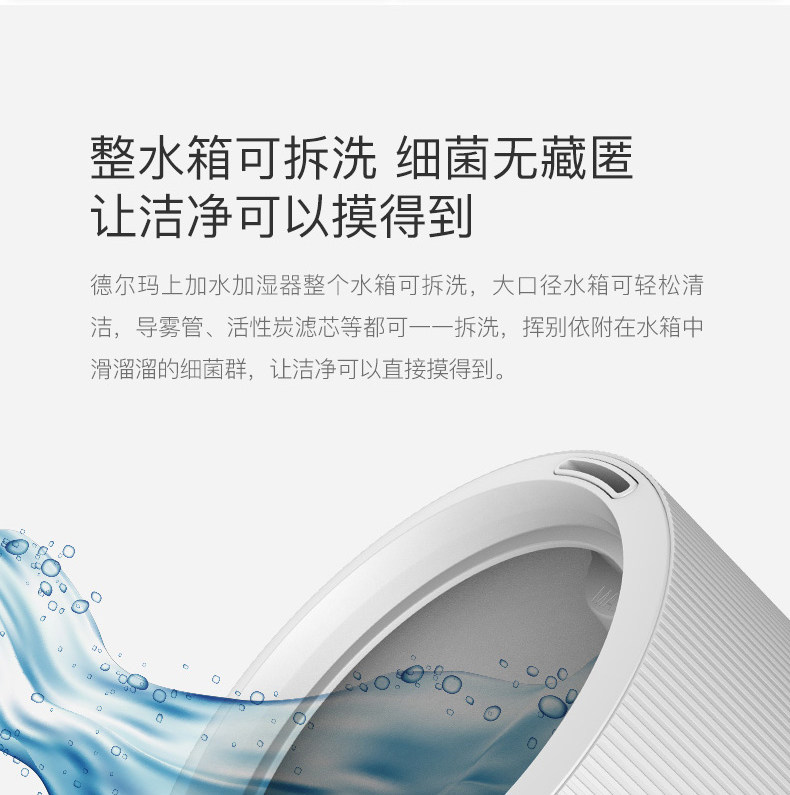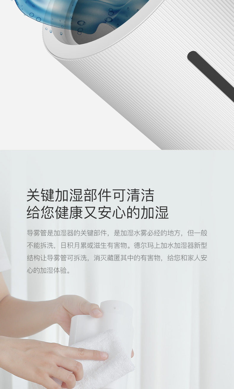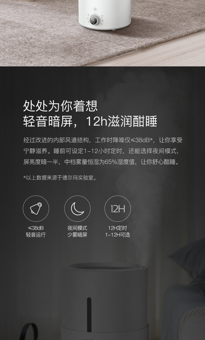 我家三个加湿器都是德尔玛的! 最主要的特点是很静音!刚给宝宝添置了这款,不仅静音,功能也很全。比较看中的是uv灯杀菌,据说比银离子杀菌要更先进些!恒湿功能也很需要,这下不用担心宝宝房间干燥了!另外,这款还可以添加精油,用了洋甘菊的,宝宝可以一夜安睡! 送的洁面仪也很精致!现在德尔玛的家电也更加多元化! 总之,以后还会选择德尔玛! 另外,客服比较很贴心!赞