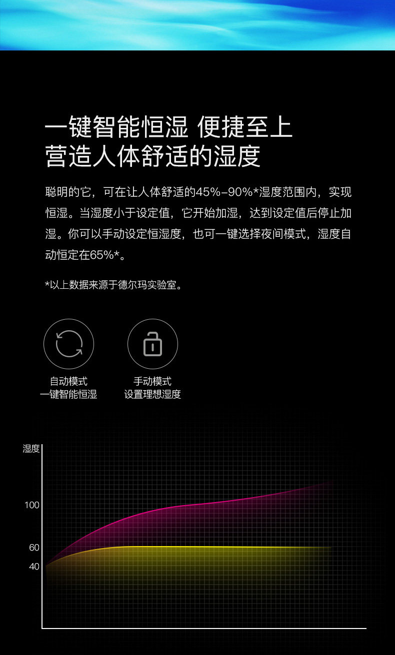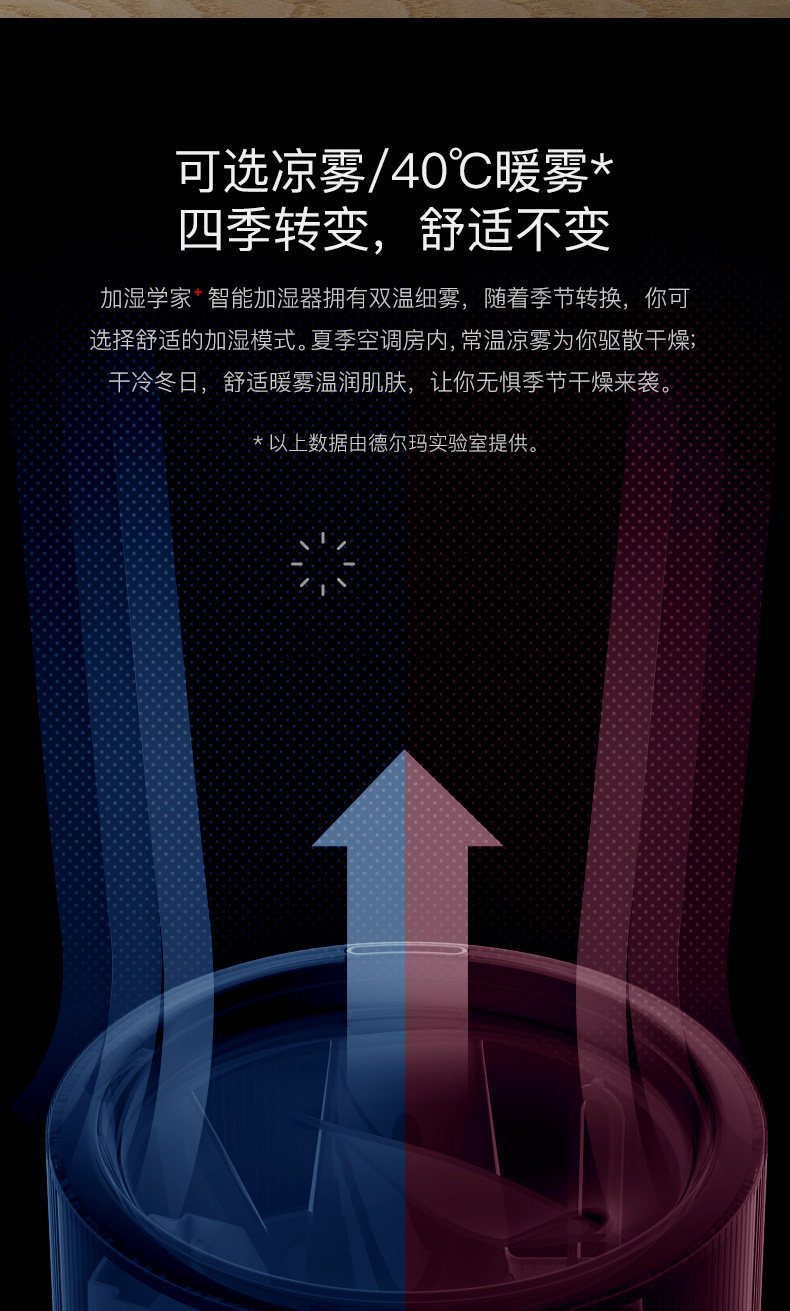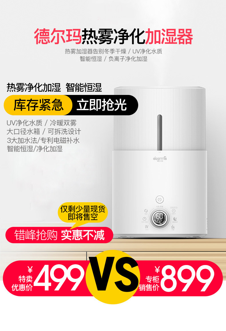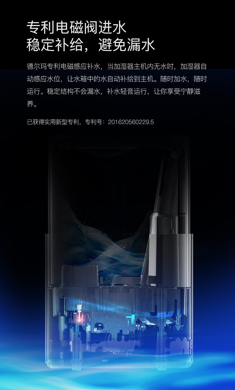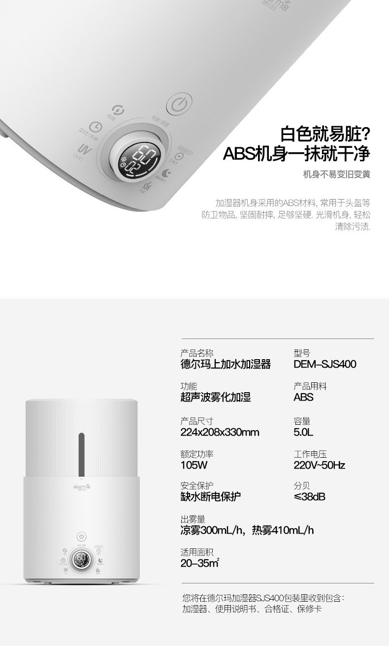 我家三个加湿器都是德尔玛的! 最主要的特点是很静音!刚给宝宝添置了这款,不仅静音,功能也很全。比较看中的是uv灯杀菌,据说比银离子杀菌要更先进些!恒湿功能也很需要,这下不用担心宝宝房间干燥了!另外,这款还可以添加精油,用了洋甘菊的,宝宝可以一夜安睡! 送的洁面仪也很精致!现在德尔玛的家电也更加多元化! 总之,以后还会选择德尔玛! 另外,客服比较很贴心!赞