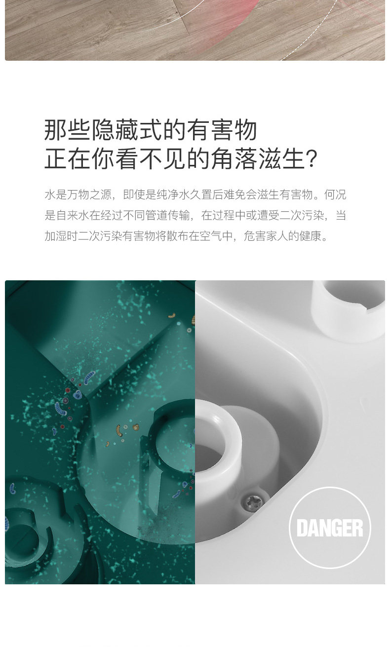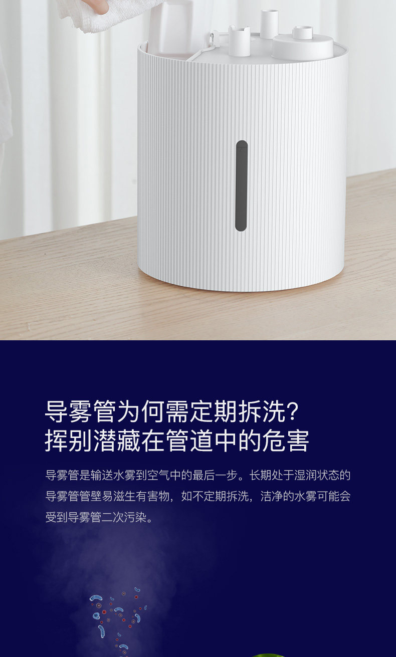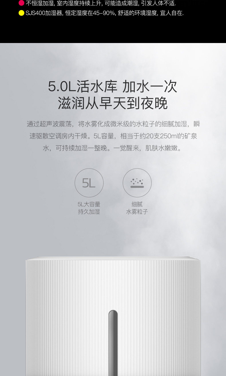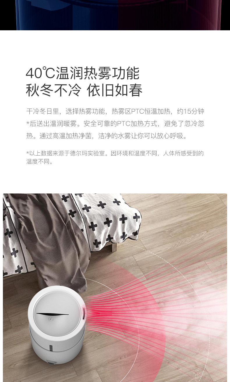 首先颜值很高。从产品上说最大档我们也照水完全没有干扰,下水声音也完全能接受,雾气真的不会打湿地面,旁边专门放了一个纸盒子早上起来一点都没湿。加湿效果有,但是北方暖气房实在干燥的原因吧一晚上自己的湿度表显示从30-38,湿度计放的比较远可能也有关系,机子能恒定50度。最后说个人感受鼻子没那么难受了,嗓子因为上火还没明显的感觉。